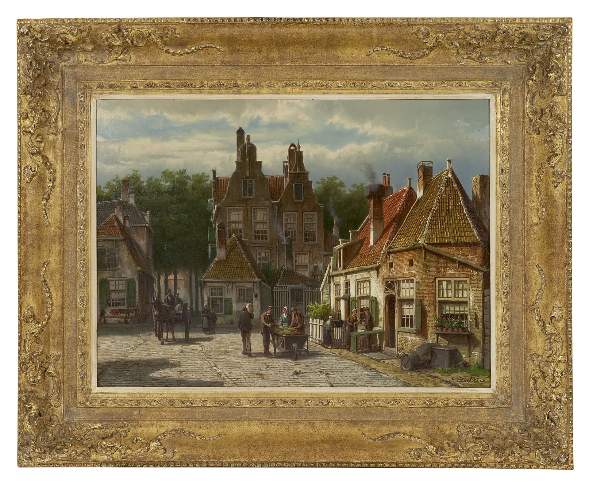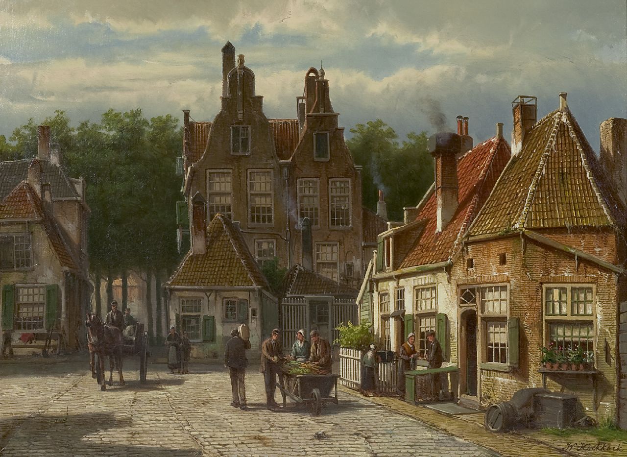 Willem Koekkoek kunstwerk • schilderij • voorheen te koop Dorpsbewoners op een zonnig plein