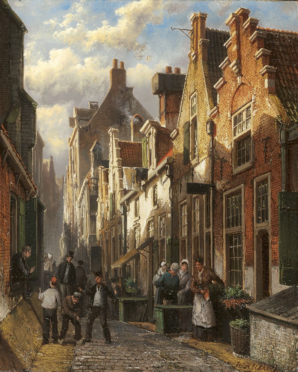 Willem Koekkoek kunstwerk • schilderij • voorheen te koop Drukbevolkt Hollands straatje bij namiddagzon