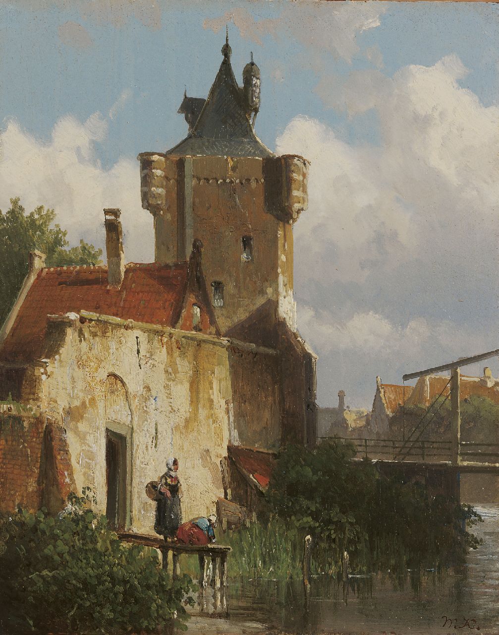 Willem Koekkoek kunstwerk • schilderij • voorheen te koop Figuren op een steiger bij een stadsgracht
