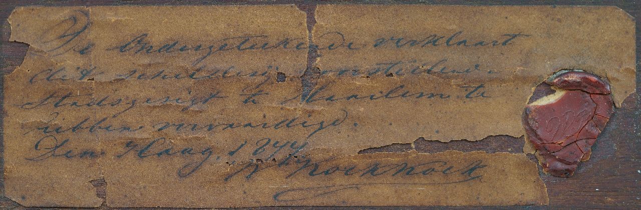 met verso authenticiteitsverklaring van de schilder op verzegeld etiket: 'De ondergetekende verklaart dit schilderij voorstellende Stadsgezigt te Haarlem te hebben vervaardigd, Den Haag, 1877, W. Koekkoek'