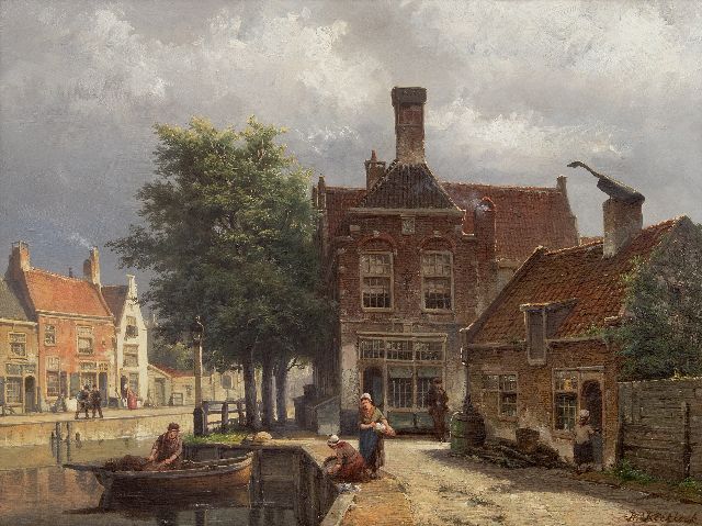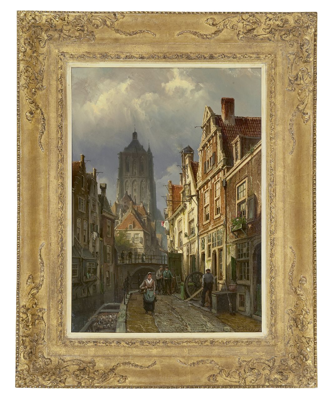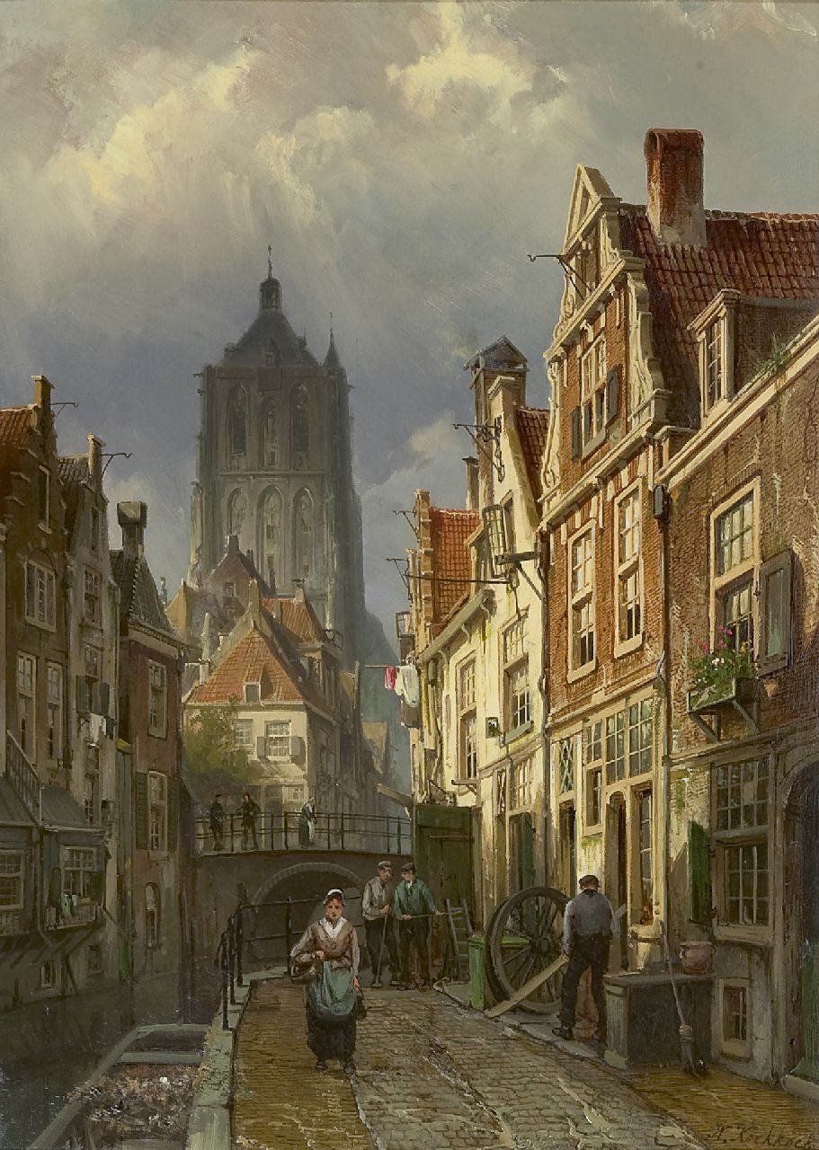 Willem Koekkoek kunstwerk • schilderij • voorheen te koop Hollands stadsgezicht met de toren van de Brielse St. Catharinakerk