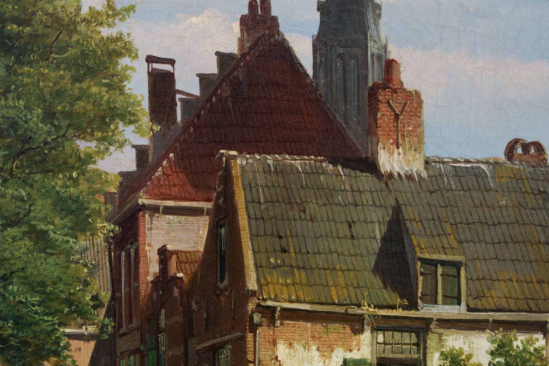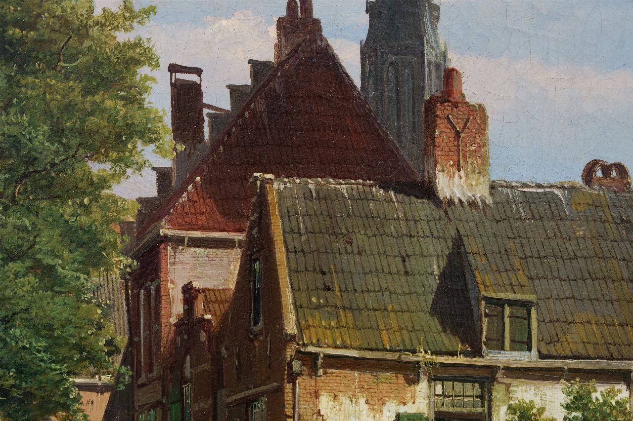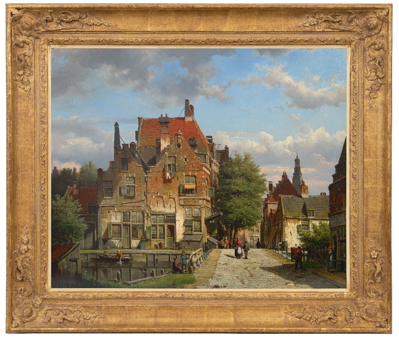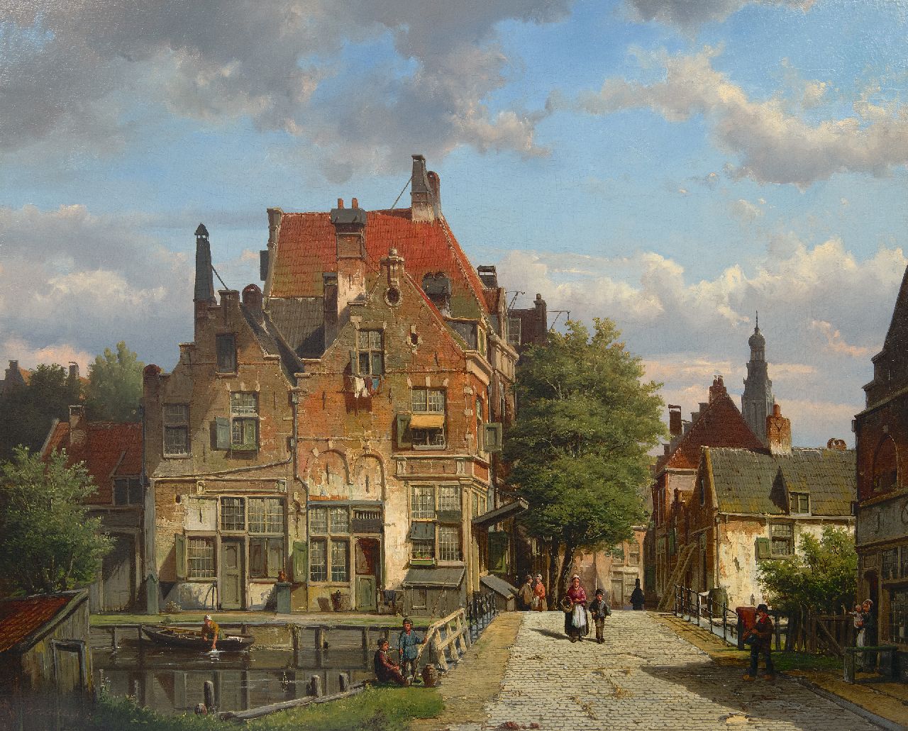 Willem Koekkoek kunstwerk • schilderij • voorheen te koop Hollands stadsgezicht met een brug over het kanaal