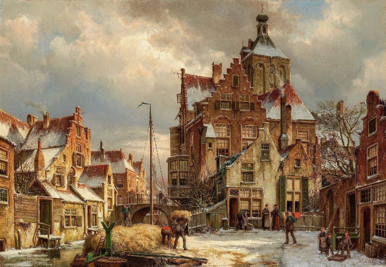 Willem Koekkoek kunstwerk • schilderij • voorheen te koop Winters stadsgezicht op Culemborg