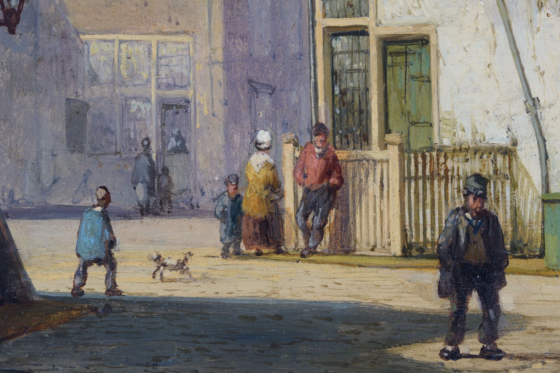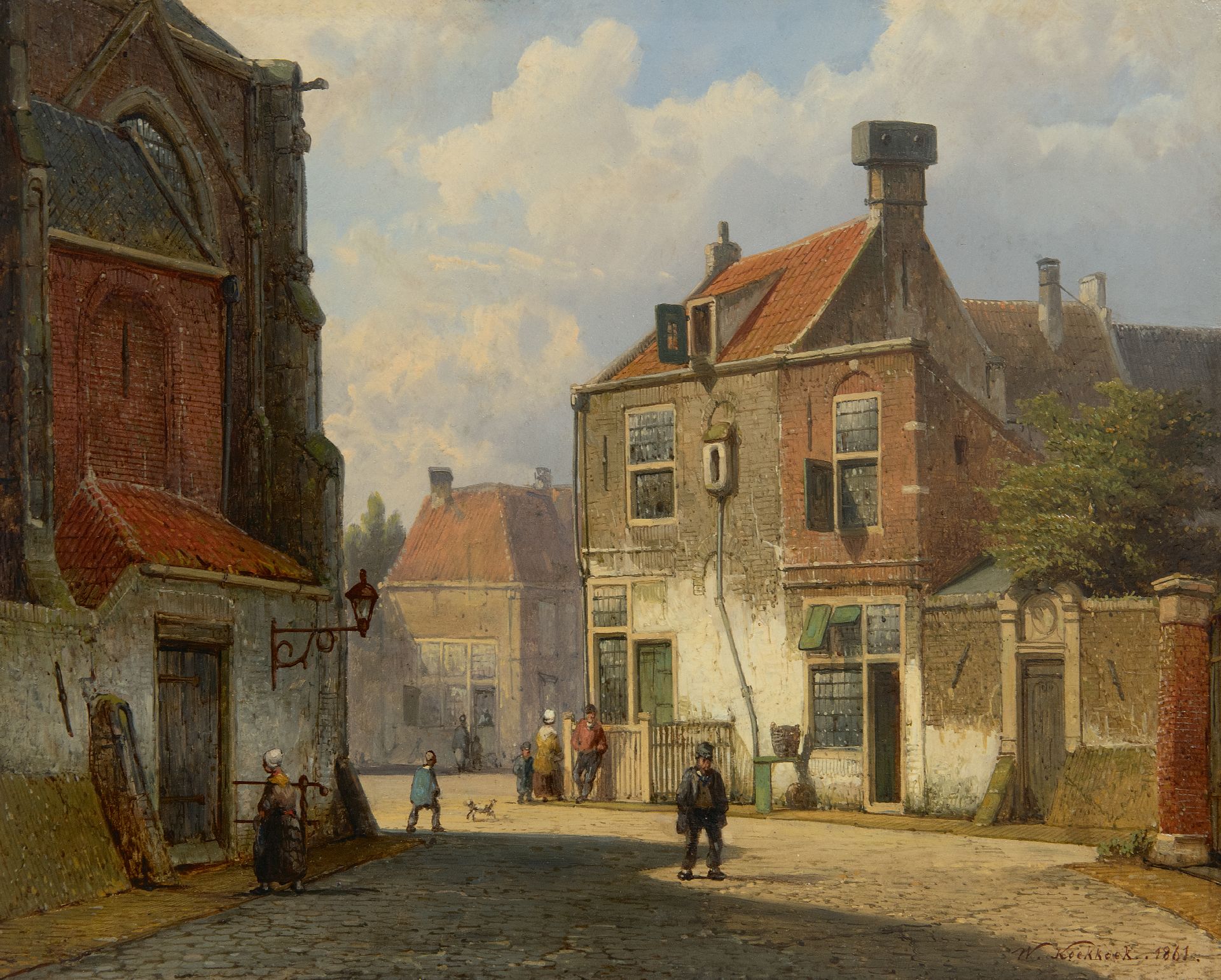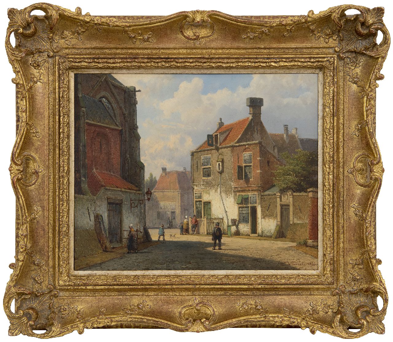 Willem Koekkoek kunstwerk • schilderij • te koop Zonnig dorpsstraatje met figuren