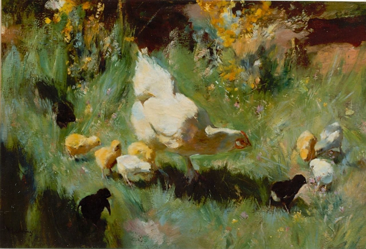 Willem Korteling kunstwerk • schilderij • voorheen te koop Moederkip met haar kuikens