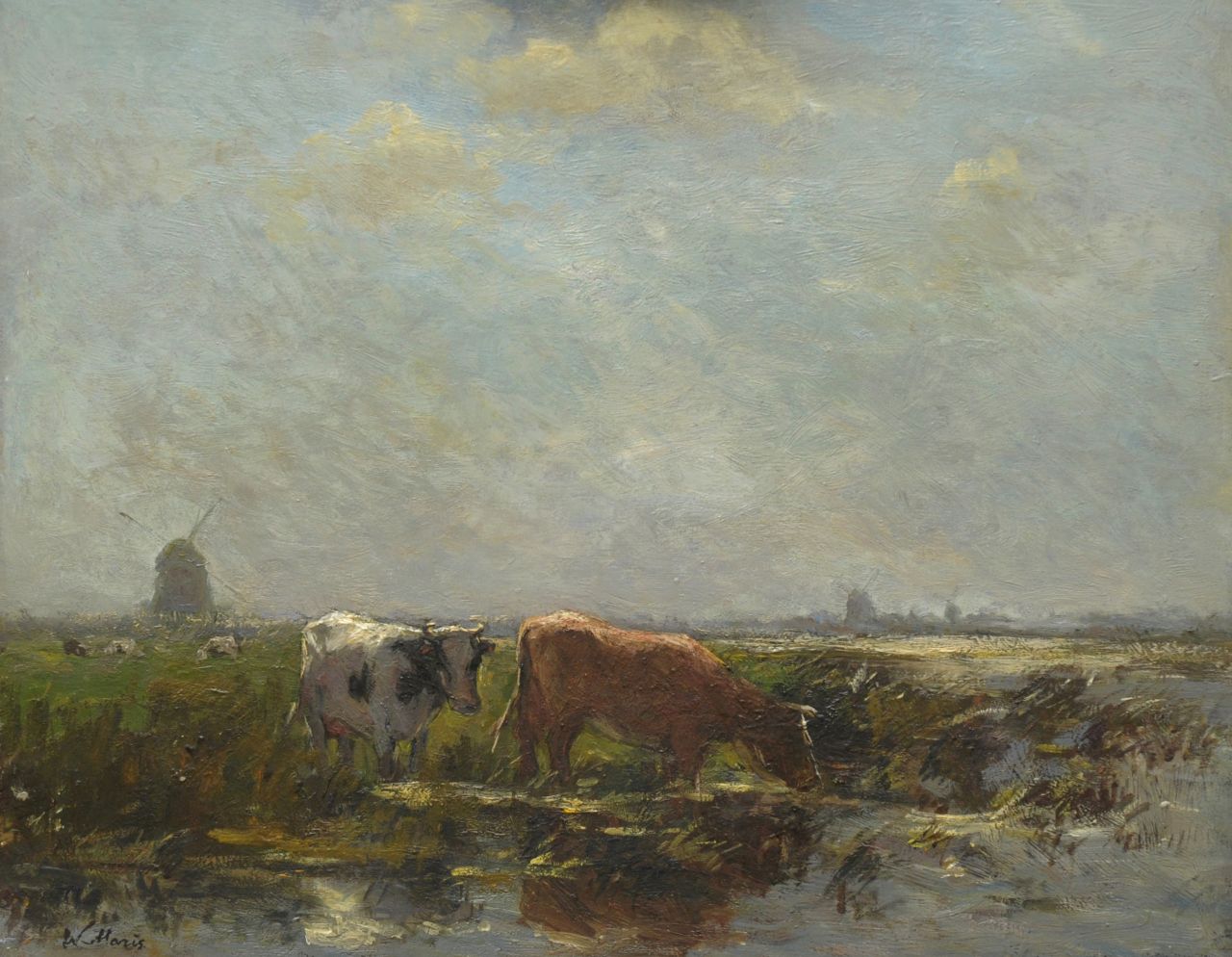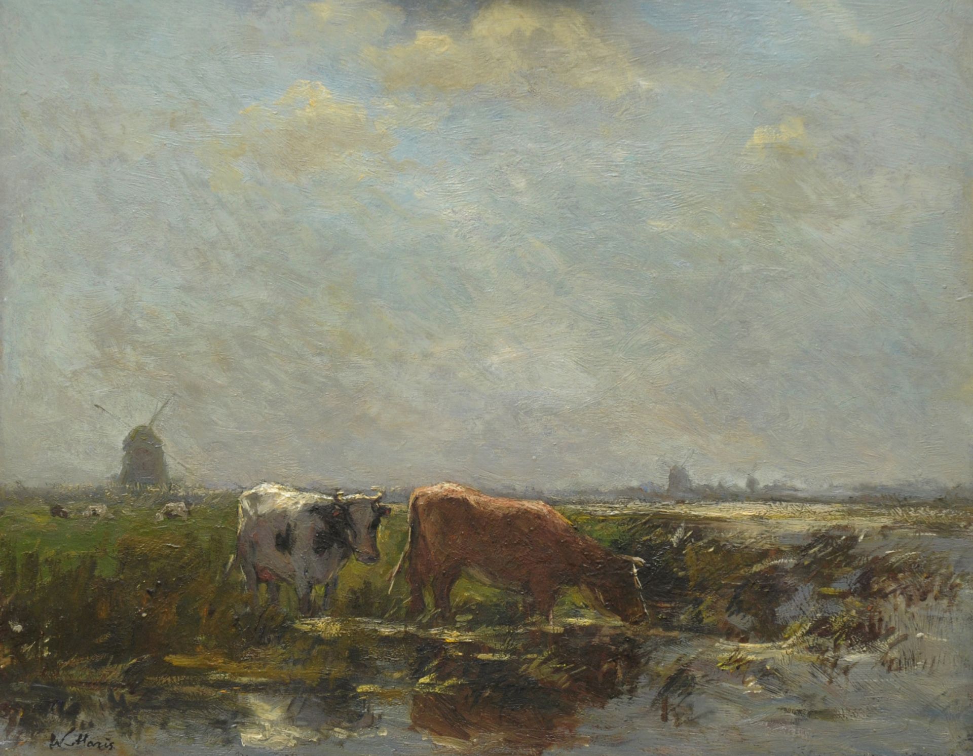 Willem Maris kunstwerk • schilderij • voorheen te koop Polderlandschap met vee en molengang