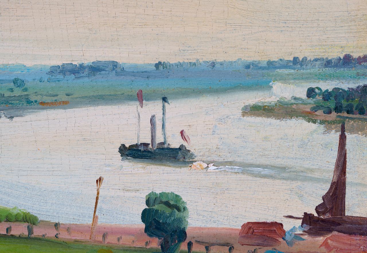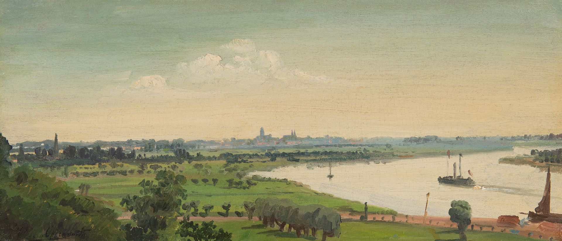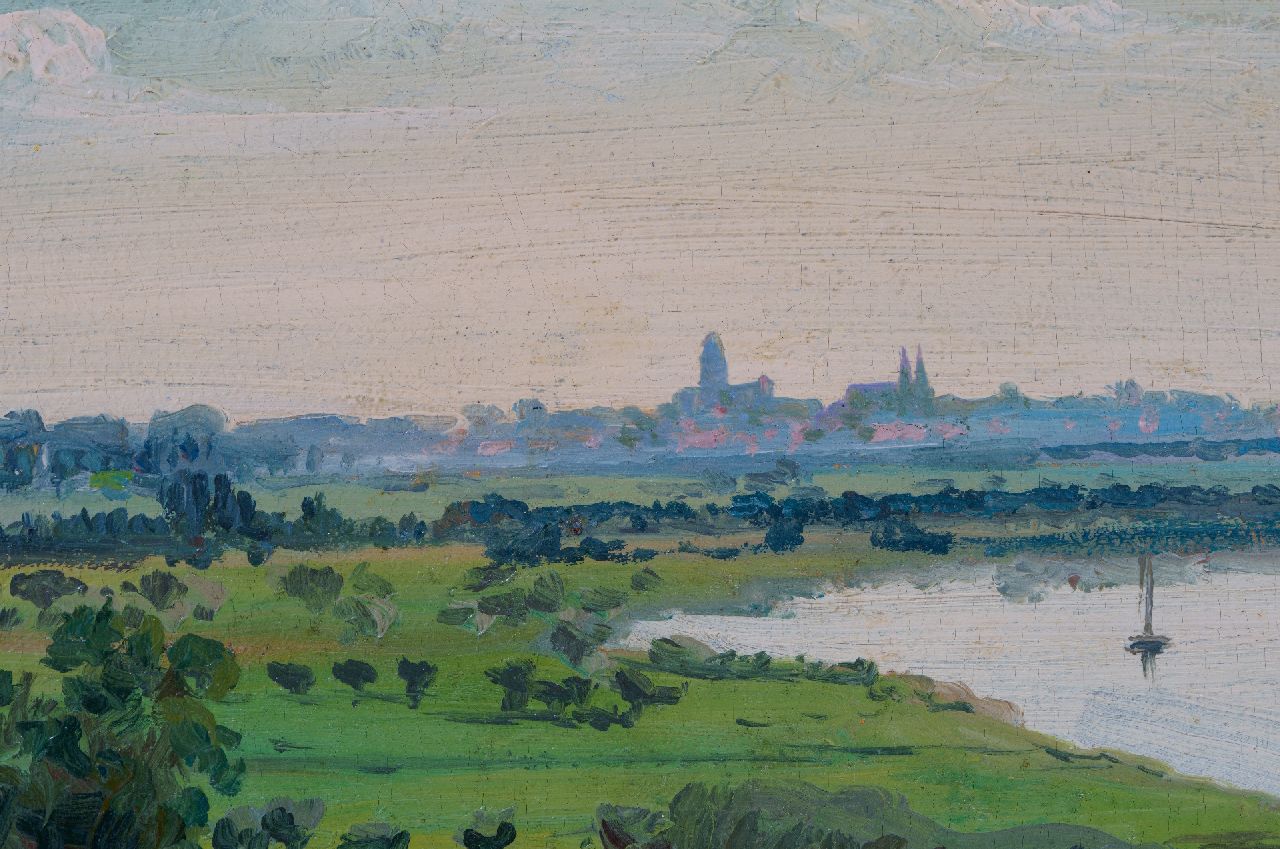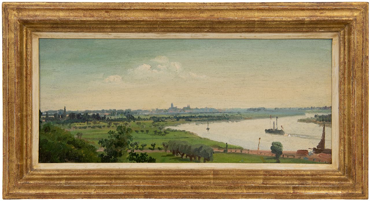Willem Oppenoorth kunstwerk • schilderij • voorheen te koop Zomers rivierlandschap met Deventer in de verte
