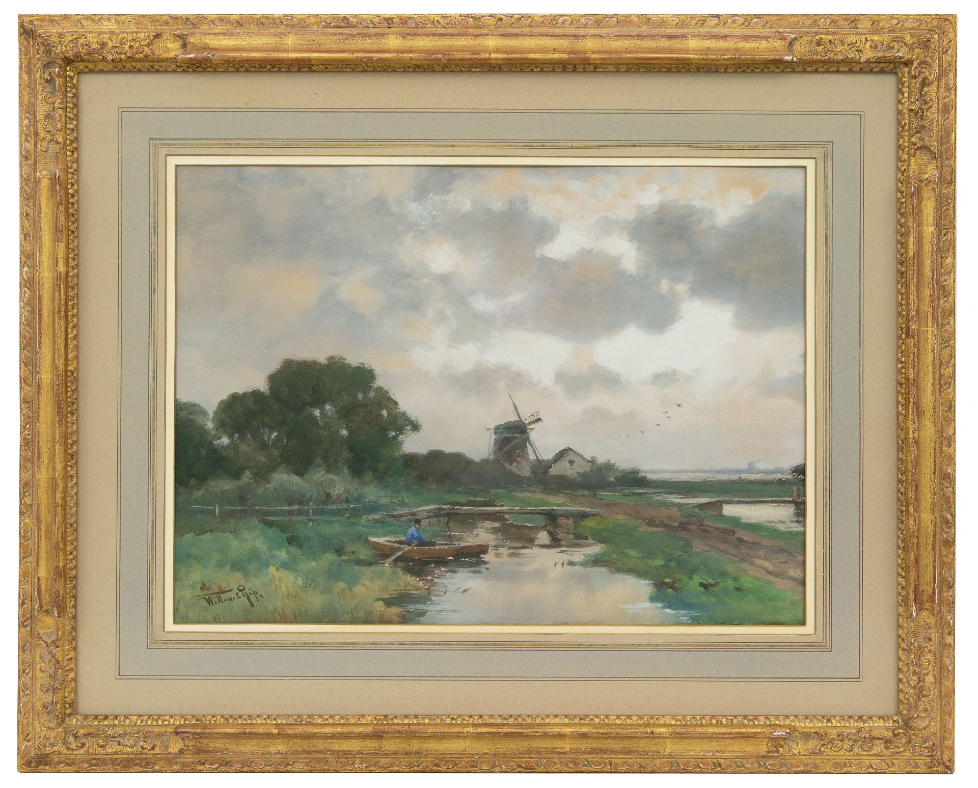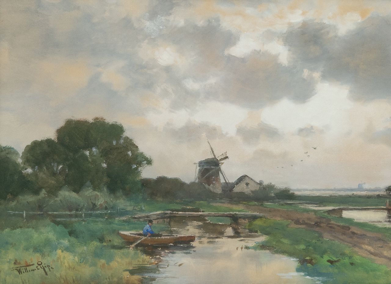 Willem Rip | Poldermolens en schuiten bij zonsondergang, olieverf op doek, 36,9 x 55,5 cm, gesigneerd r.o.