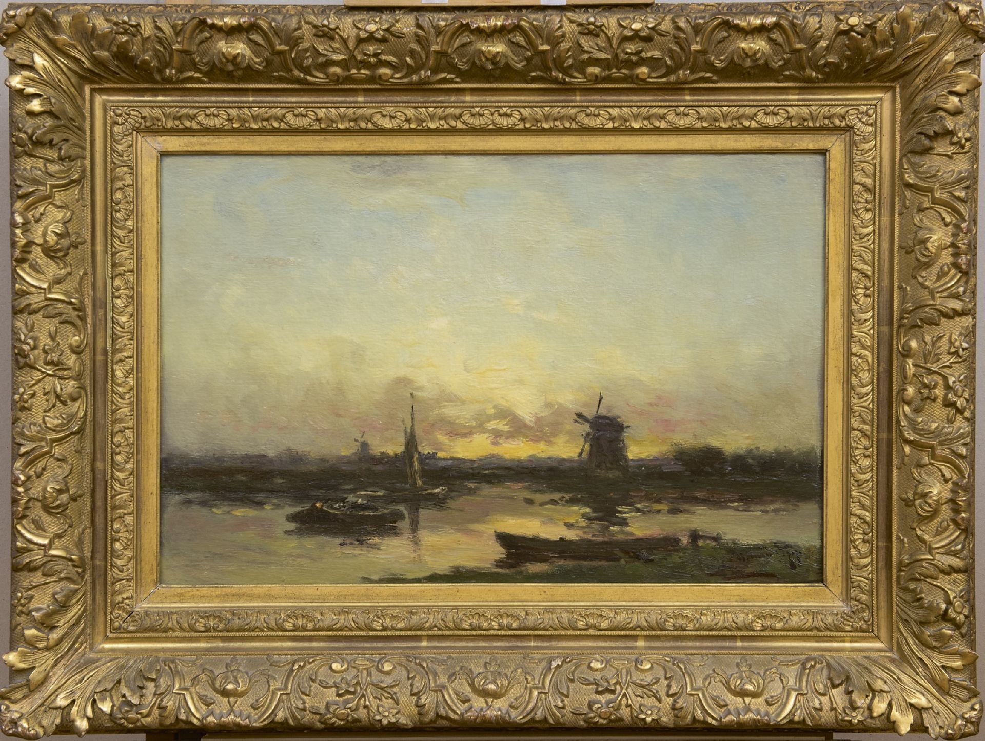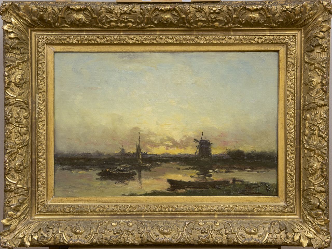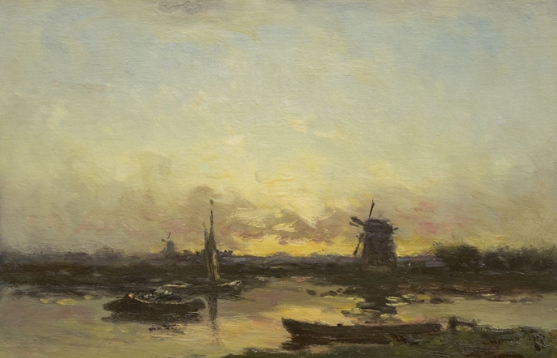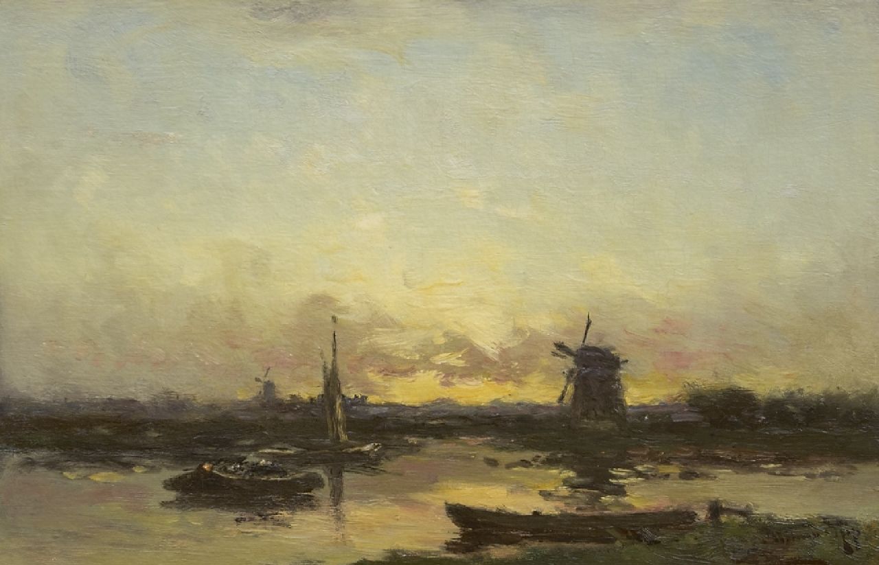 Willem Rip kunstwerk • schilderij • te koop Poldermolens en schuiten bij zonsondergang