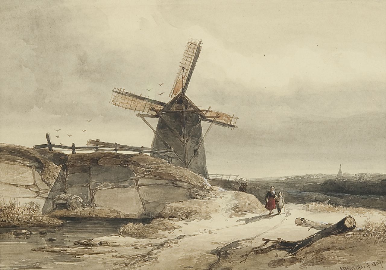 Willem Roelofs kunstwerk • aquarel • tekening • voorheen te koop Molen in heuvelachtig landschap