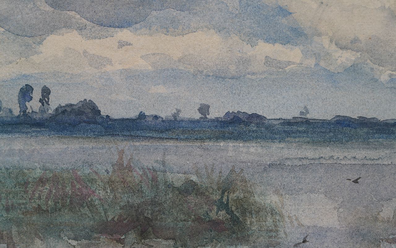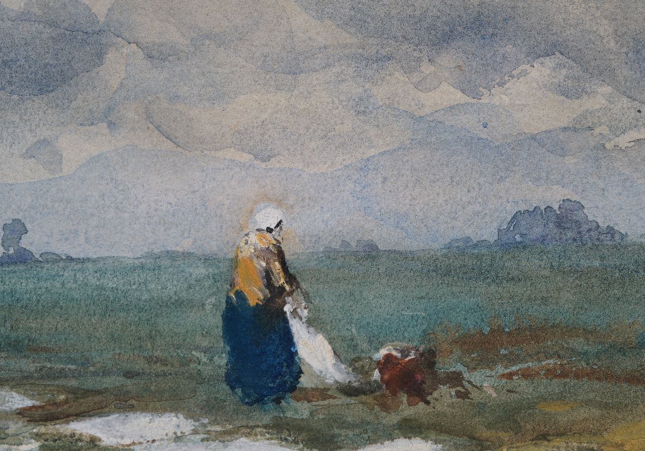 Willem Roelofs kunstwerk • aquarel • tekening • te koop Waterlandschap met wasvlonder en bleekveldje