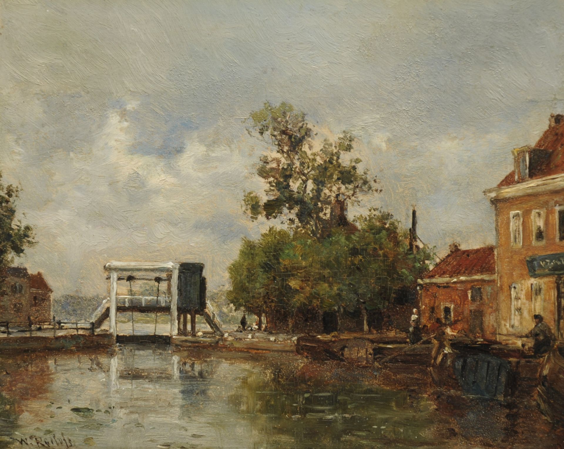 Willem Roelofs kunstwerk • schilderij • voorheen te koop Afgemeerde platbodems bij sluisje in Leidschendam