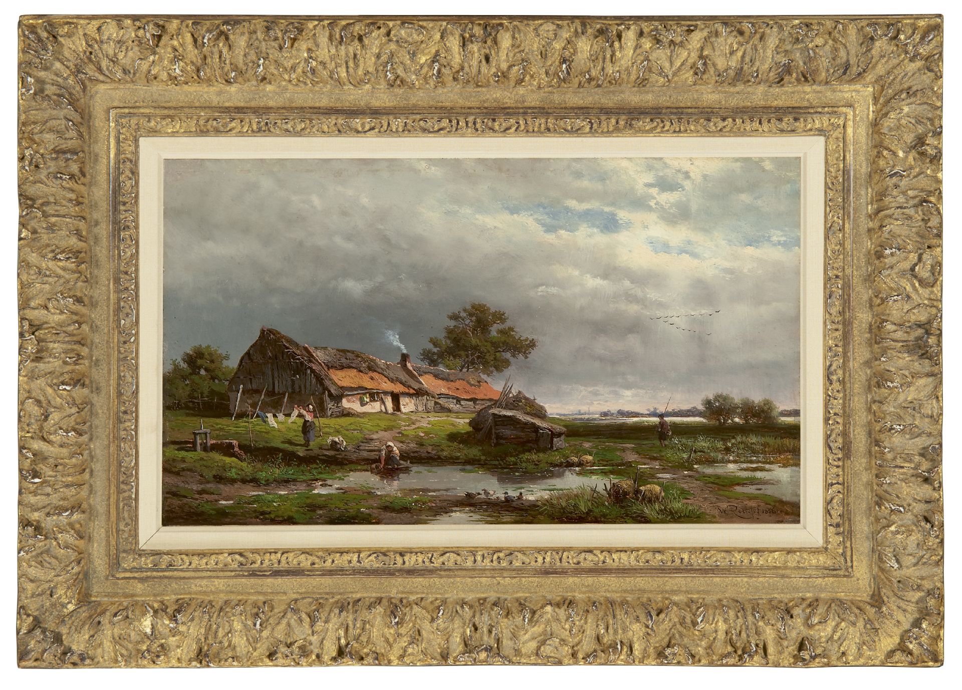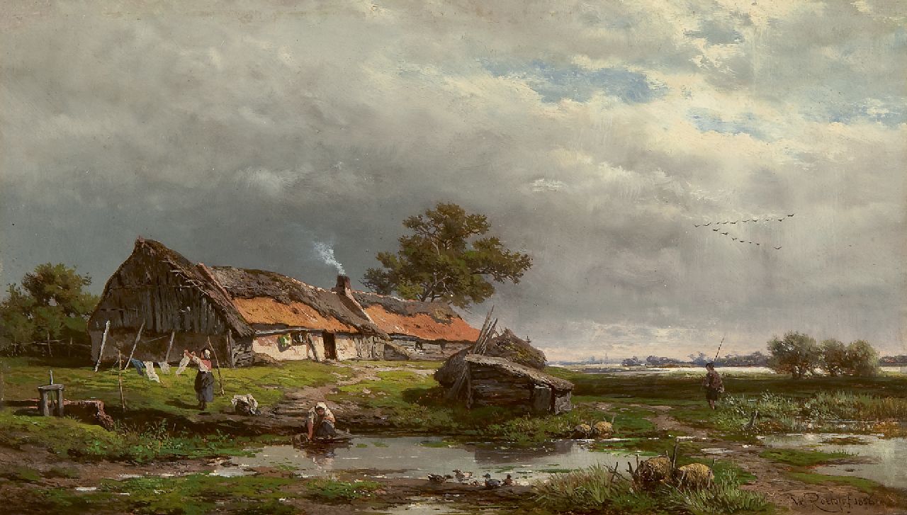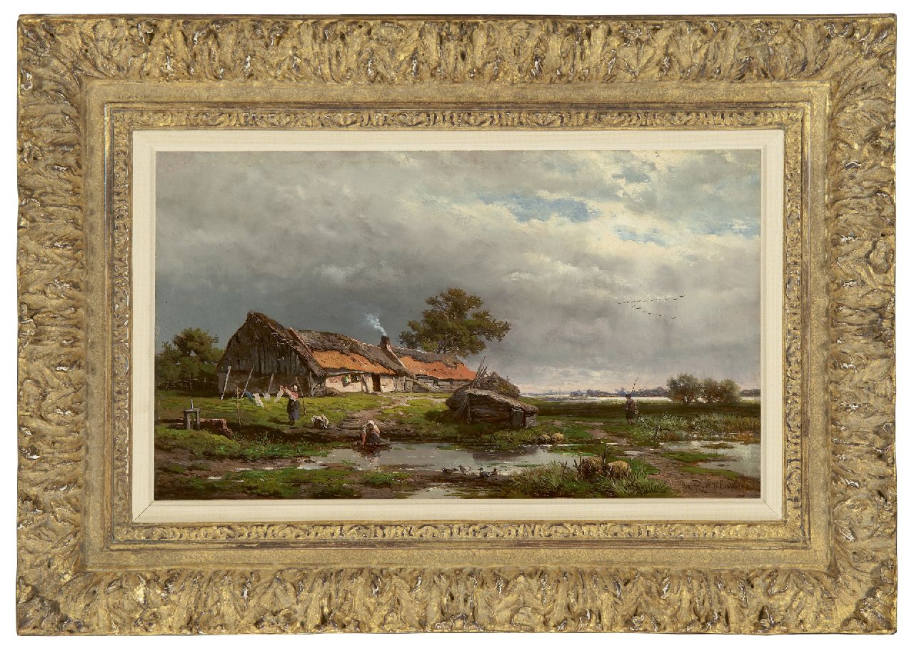 Willem Roelofs kunstwerk • schilderij • voorheen te koop Bedrijvigheid rond een boerenhut