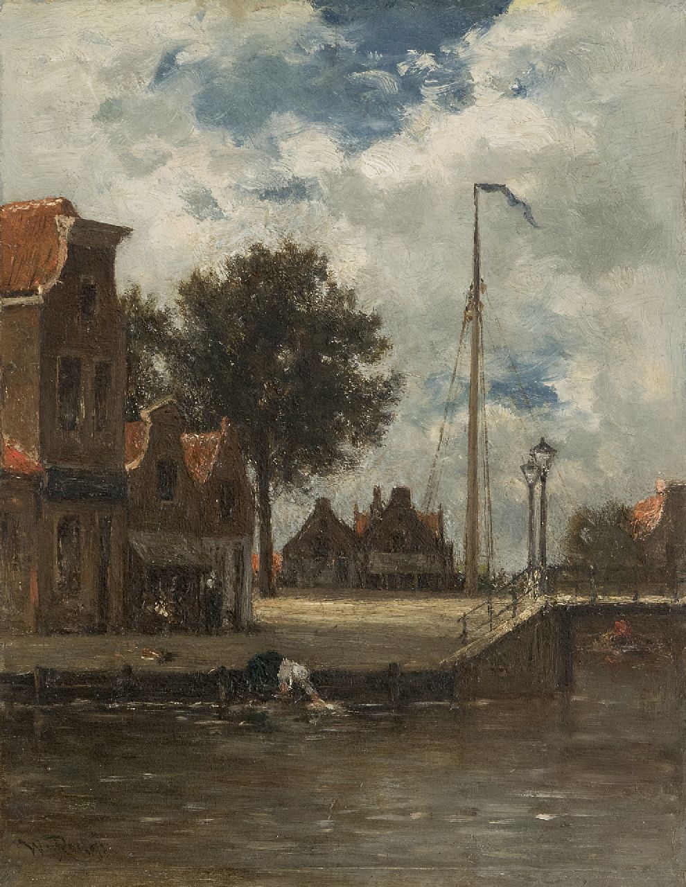 Willem Roelofs kunstwerk • schilderij • voorheen te koop Dorpsvaart met vrouw aan de was (mogelijk Edam)