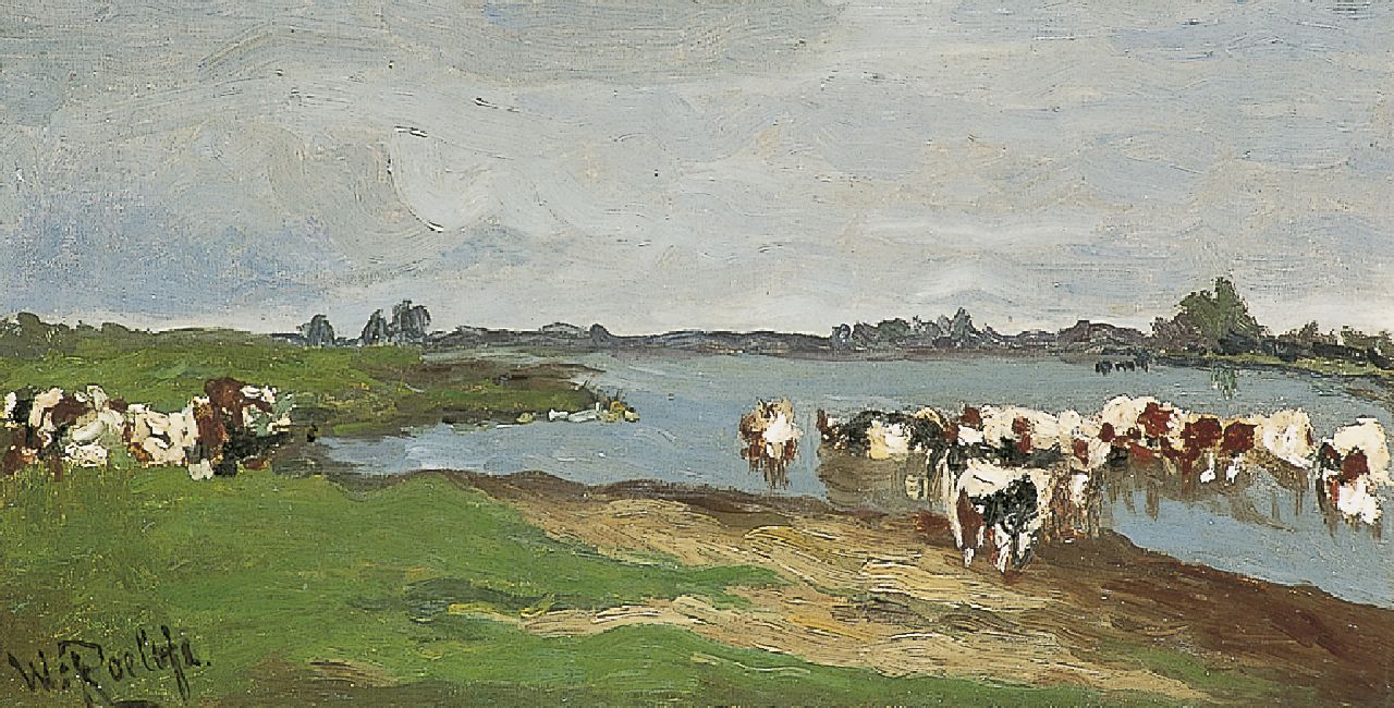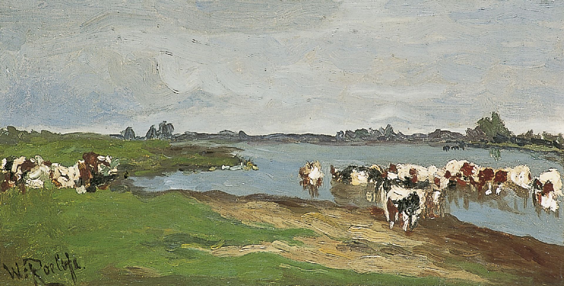 Willem Roelofs kunstwerk • schilderij • voorheen te koop Koeien bij een vaart