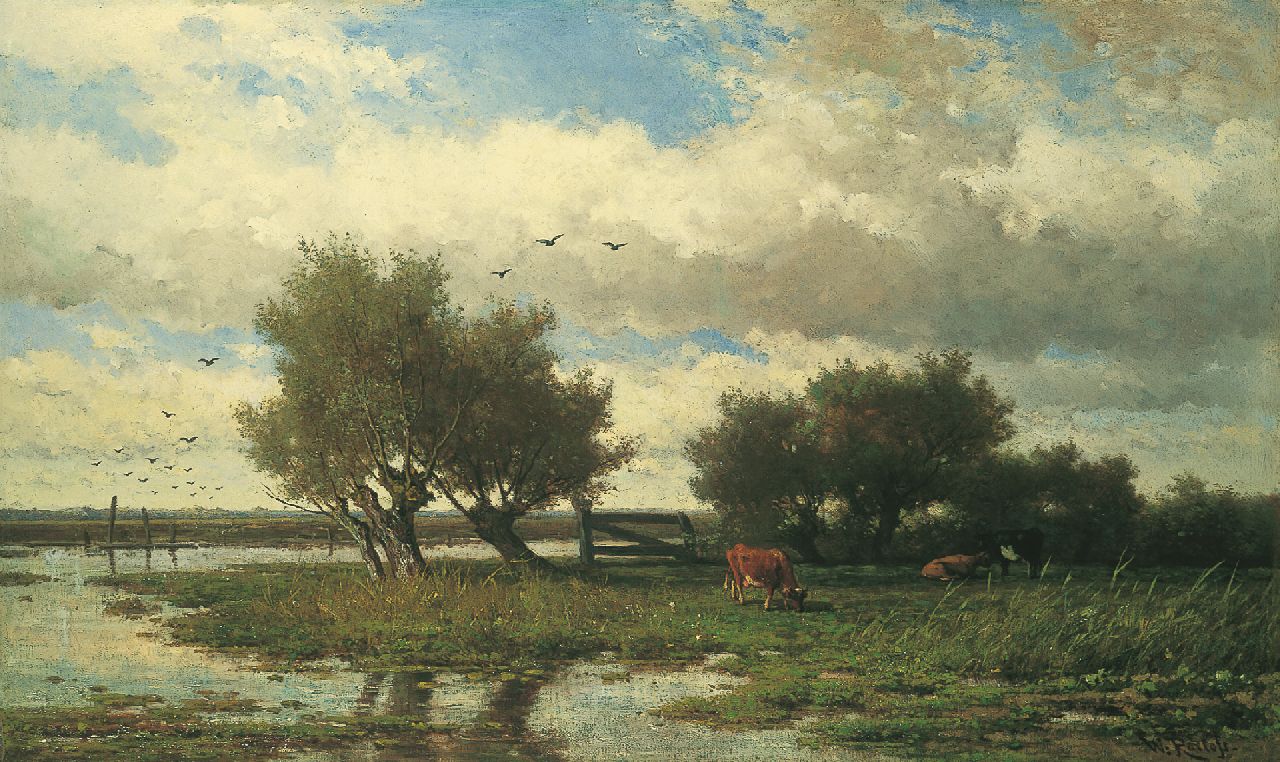 Willem Roelofs wordt wel de grote voorloper van de Haagse School genoemd. Hij schilderde bosgezichten en breed opgezette landschappen waarin hij het weidse en vlakke van het Hollandse polderlandschap met zijn water en koeien raak weet te treffen. Onder invloed van de Franse School van Barbizon trok hij er regelmatig op uit om in de natuur te schilderen. Zo kon hij in een losse toets het steeds wisselende effect van licht en schaduw op het landschap vastleggen. Een groot deel van zijn leven woonde Willem Roelofs in Brussel, maar hij kwam vaak naar Nederland om er inspiratie op te doen en te schilderen.