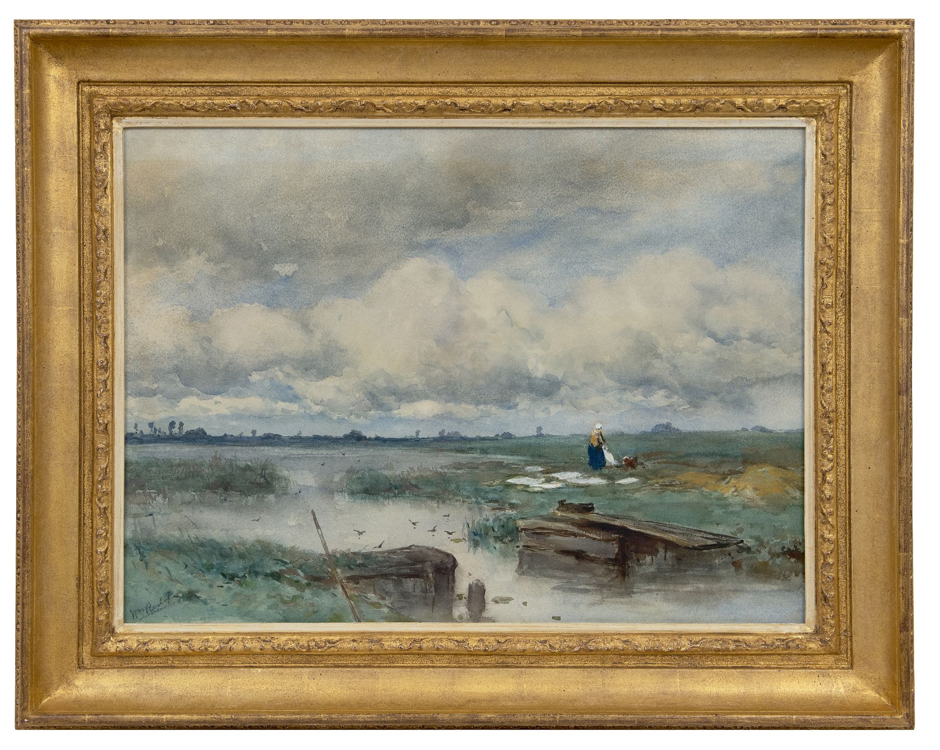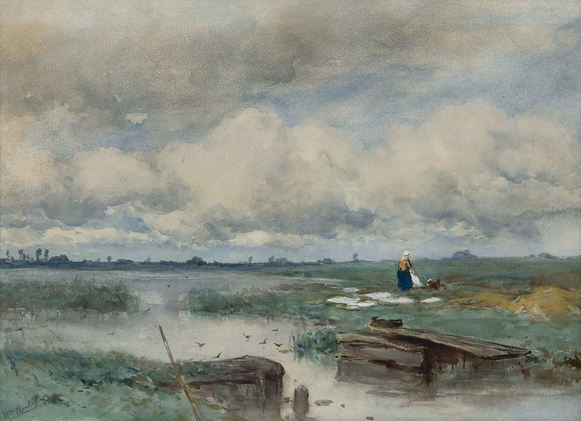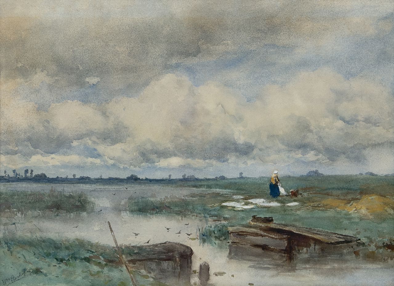 Willem Roelofs kunstwerk • aquarel • tekening • te koop Waterlandschap met wasvlonder en bleekveldje