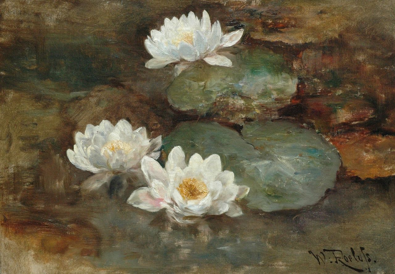 Een Nederlandse Monet! Een zeldzaam werk in het oeuvre van Roelofs, die we vooral van zijn Hollandse landschappen kennen. Na zijn verhuizing in 1847 naar Brussel kwam hij jaarlijks naar Nederland om het polderlandschap te schilderen. Hij zag er molens en drassige weiden onder zware wolkenluchten, waar koeien graasden aan de waterkant. Maar ook trof hij er de witte waterlelie aan in de ondiepe sloten en plassen van het laagveengebied rond de Nieuwkoopse Plassen en bij Loosdrecht. Meestal speelt deze een ondergeschikte rol op de achtergrond van zijn schilderijen. Maar op dit bijzondere werk van Roelofs kreeg de waterlelie de hoofdrol zoals Monet deed dit een paar decennia later zou doen dit tussen 1914-1926 op zijn serie schilderijen met waterlelies voor het Musée de l'Orangerie in Parijs. Roelofs zal een studie van de lelies gemaakt hebben zoals hij dat vaak deed tijdens zijn ontdekkingstochten in de natuur. Deze studies dienden als geheugensteuntje voor de uitwerking van een schets in het atelier en moesten volgens hem ‘de adem der natuur’ in zich hebben.