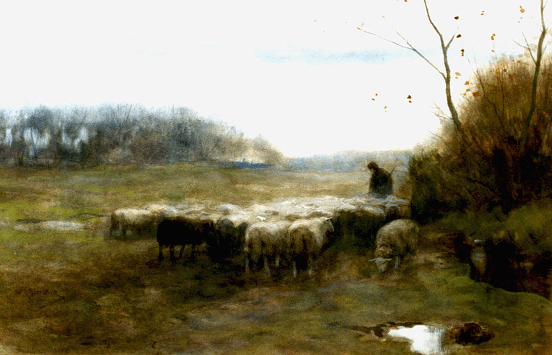 Willem Steelink jr. kunstwerk • aquarel • tekening • voorheen te koop Een schaapherder met zijn kudde