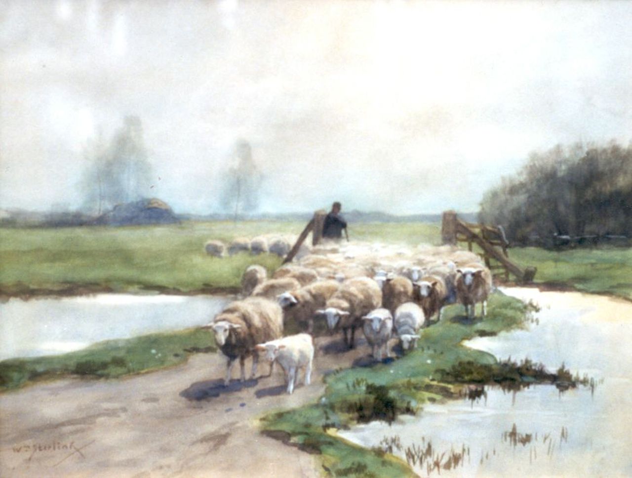 Willem Steelink jr. | Herder met schapen, aquarel op papier, 28,0 x 41,0 cm, gesigneerd r.o.