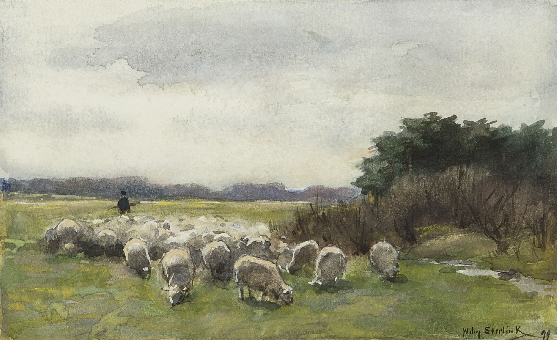 Willem Steelink jr. kunstwerk • aquarel • tekening • voorheen te koop Herder met zijn schapen
