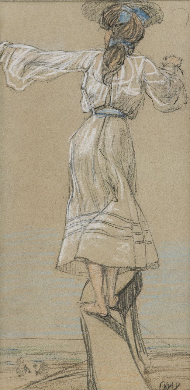 Willem Vaarzon Morel kunstwerk • aquarel • tekening • voorheen te koop Jong meisje op de uitkijk aan zee