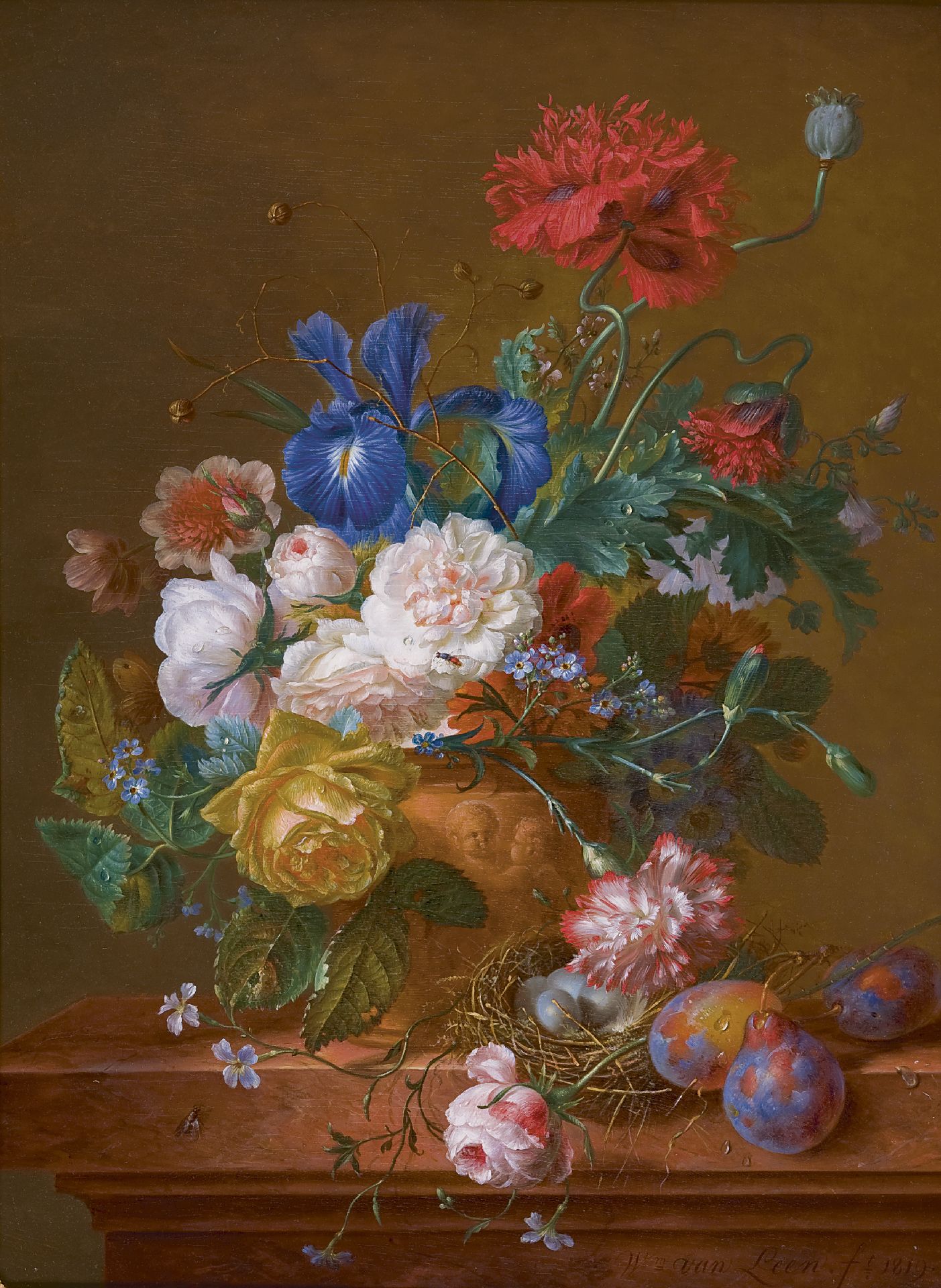 Willem van Leen kunstwerk • schilderij • voorheen te koop Stilleven met bloemen en vogelnest