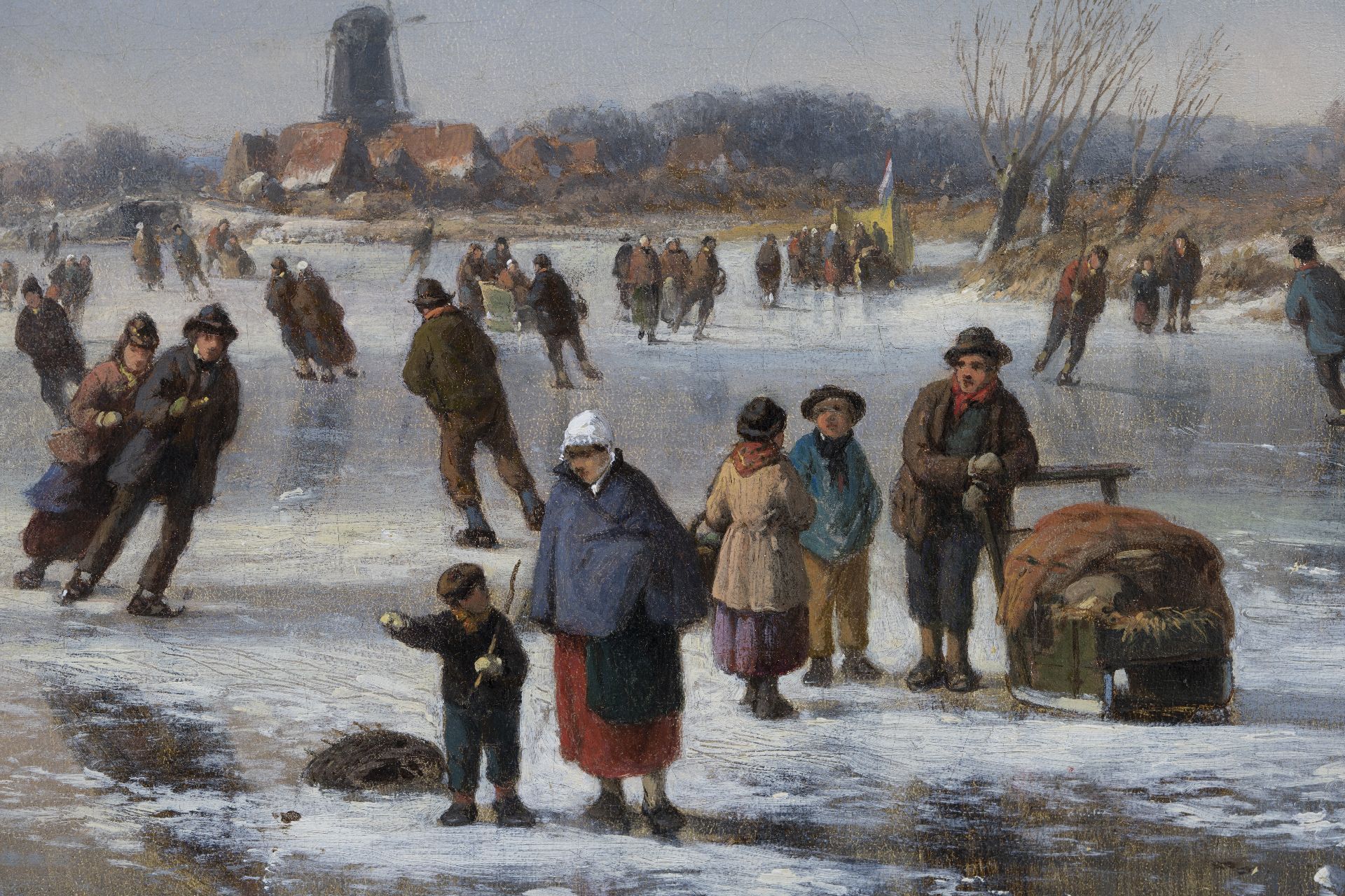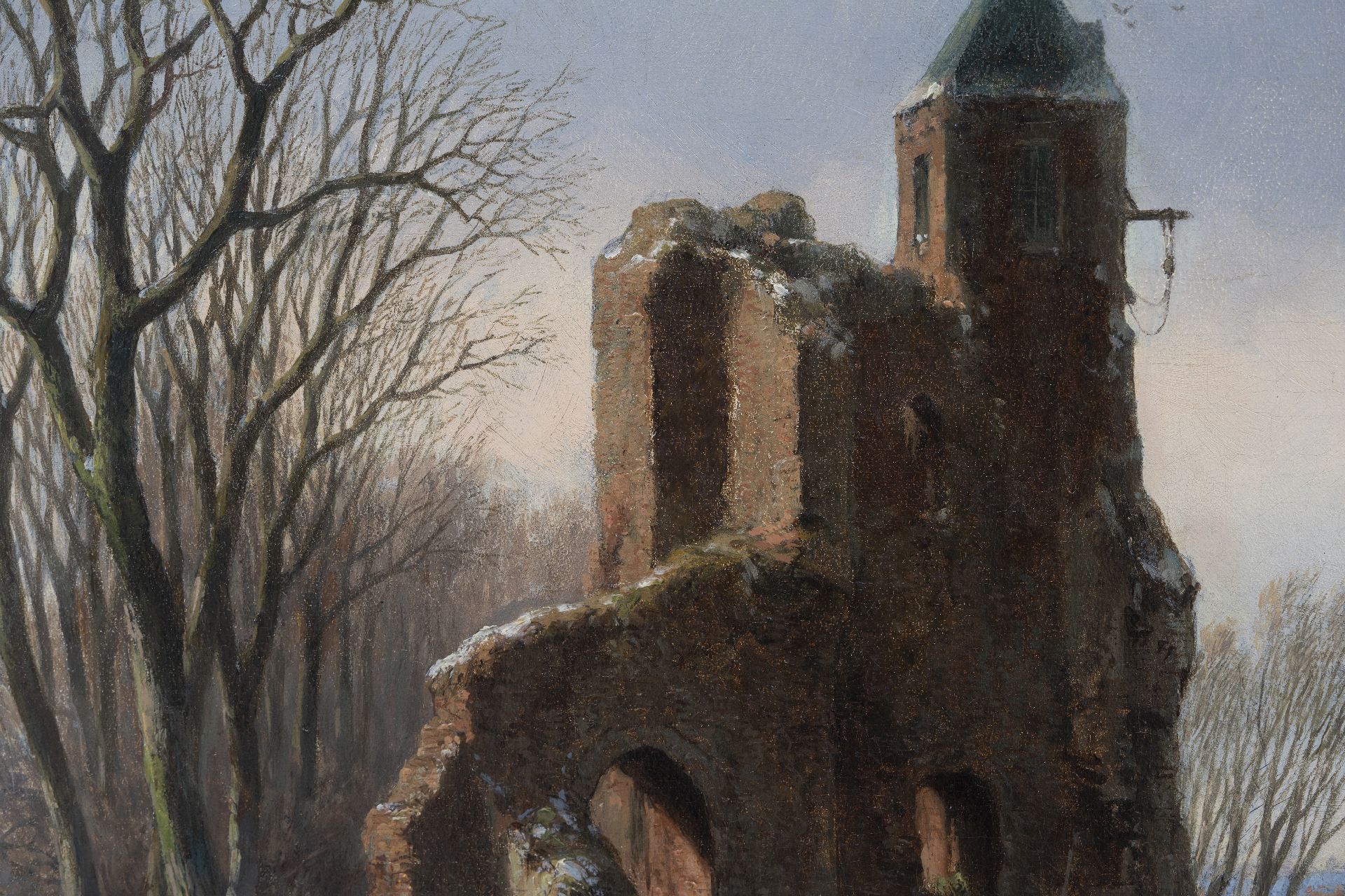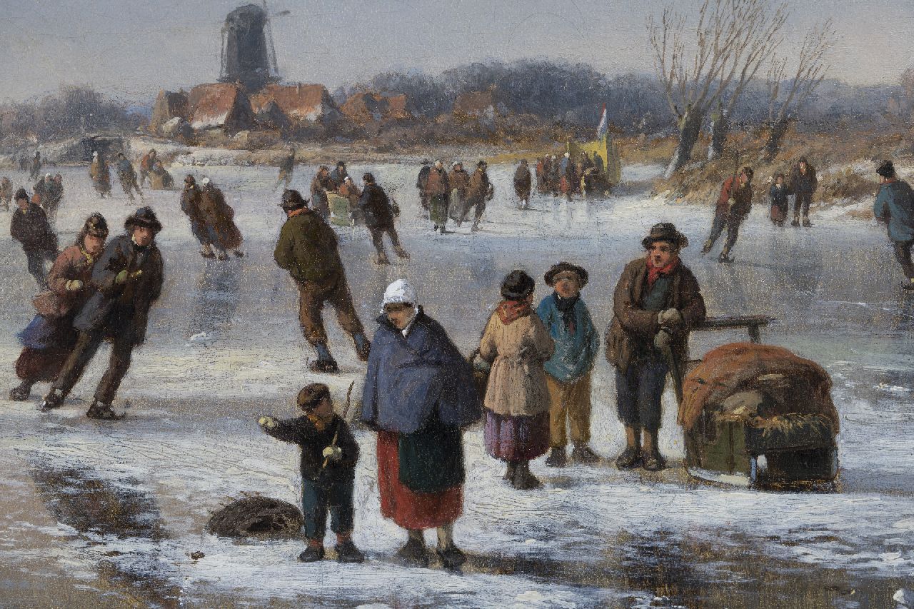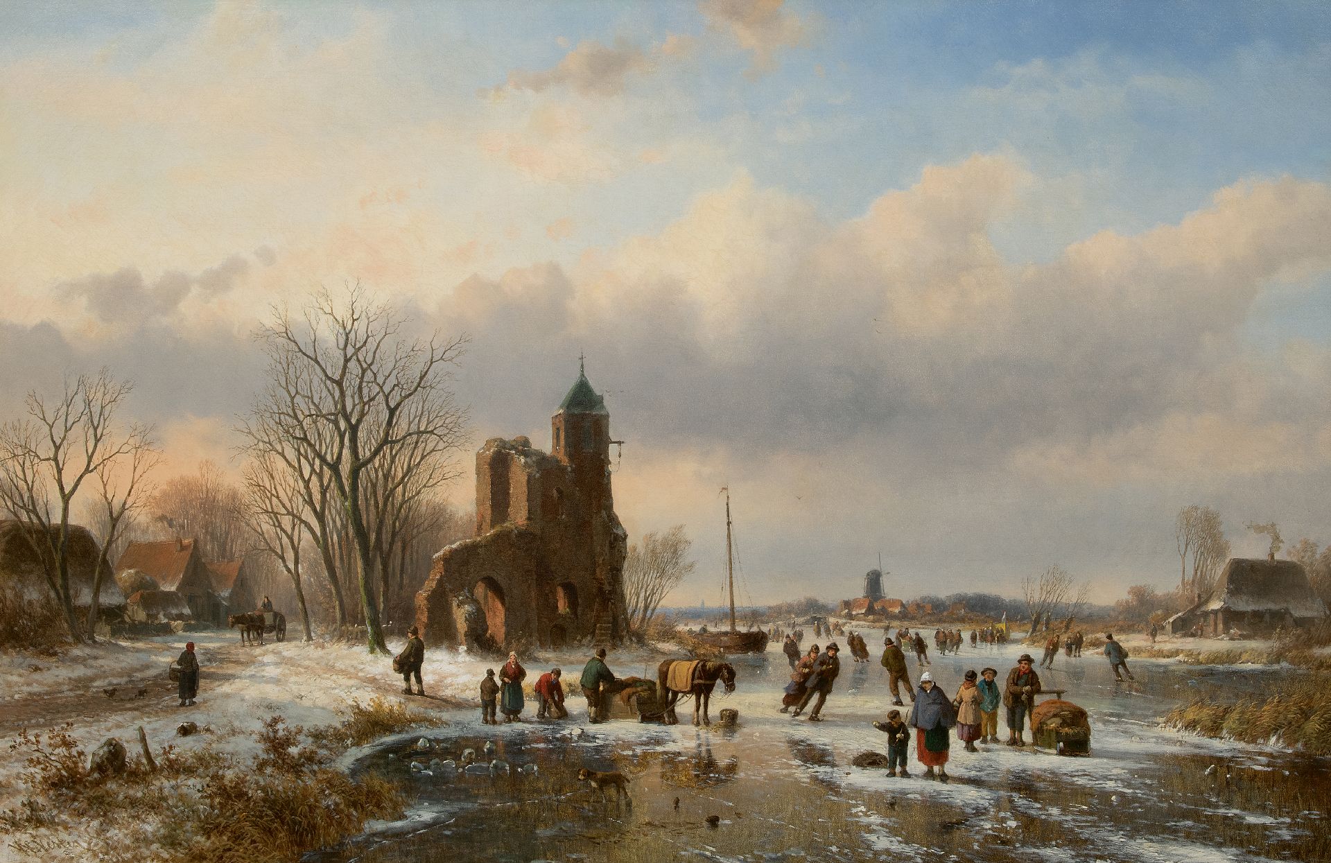 Willem Vester kunstwerk • schilderij • voorheen te koop Schaatsers op het ijs bij een kasteelruïne