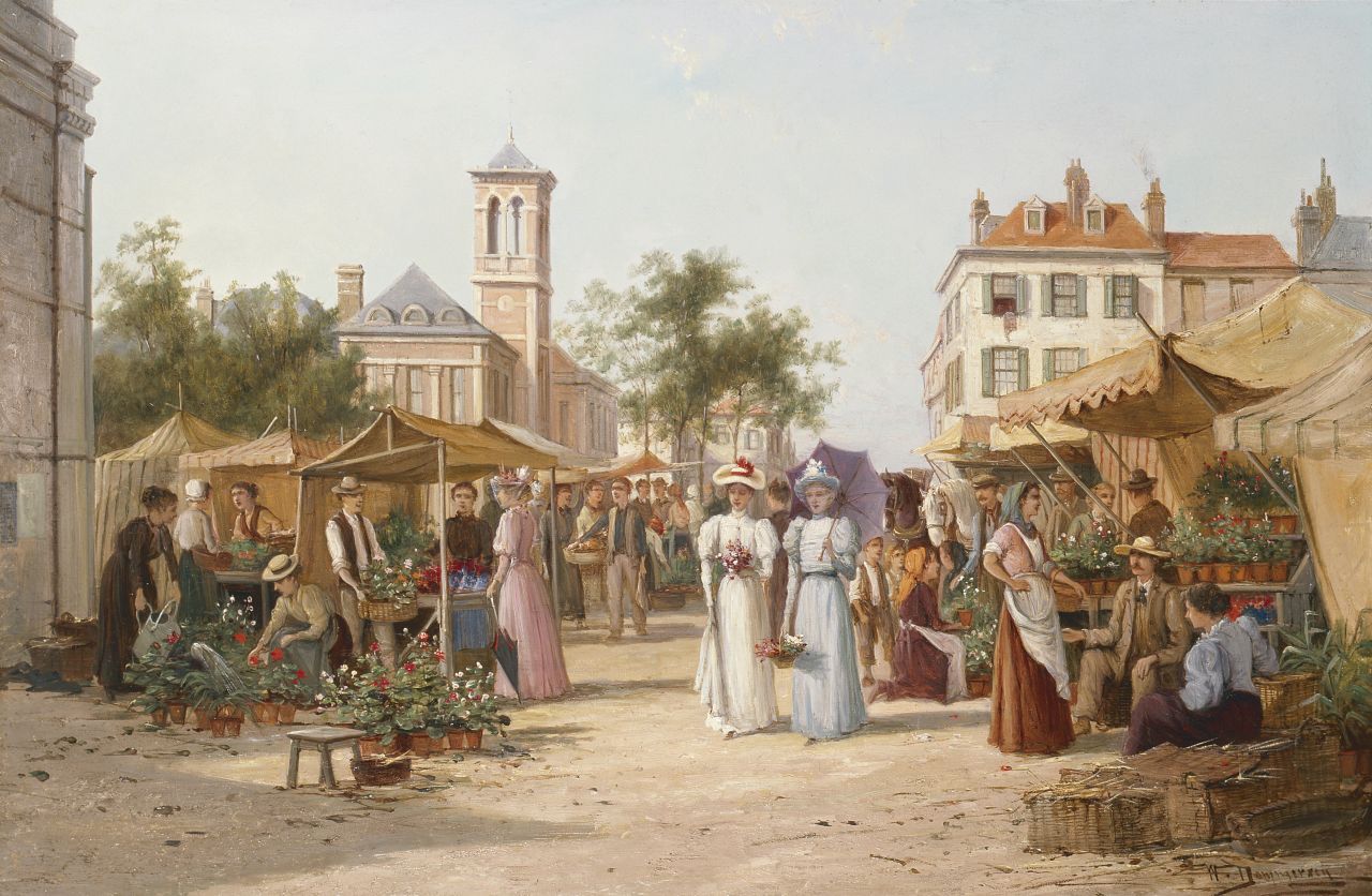 William Raymond Dommerson kunstwerk • schilderij • voorheen te koop Elegante dames op Limburgse bloemenmarkt