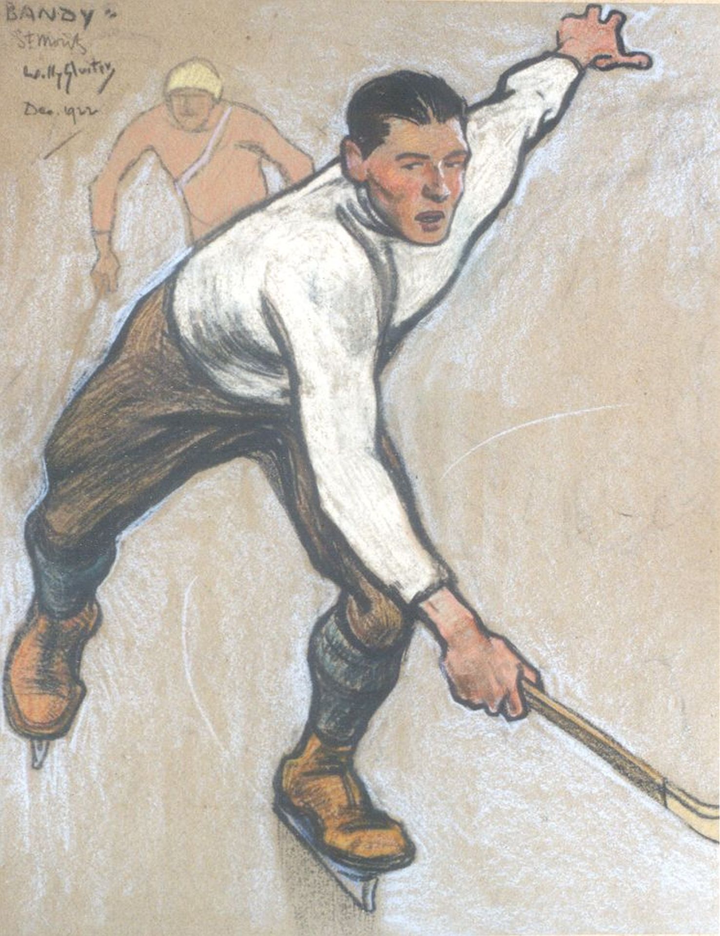 Willy Sluiter kunstwerk • aquarel • tekening • voorheen te koop Bandyspelers in St. Moritz