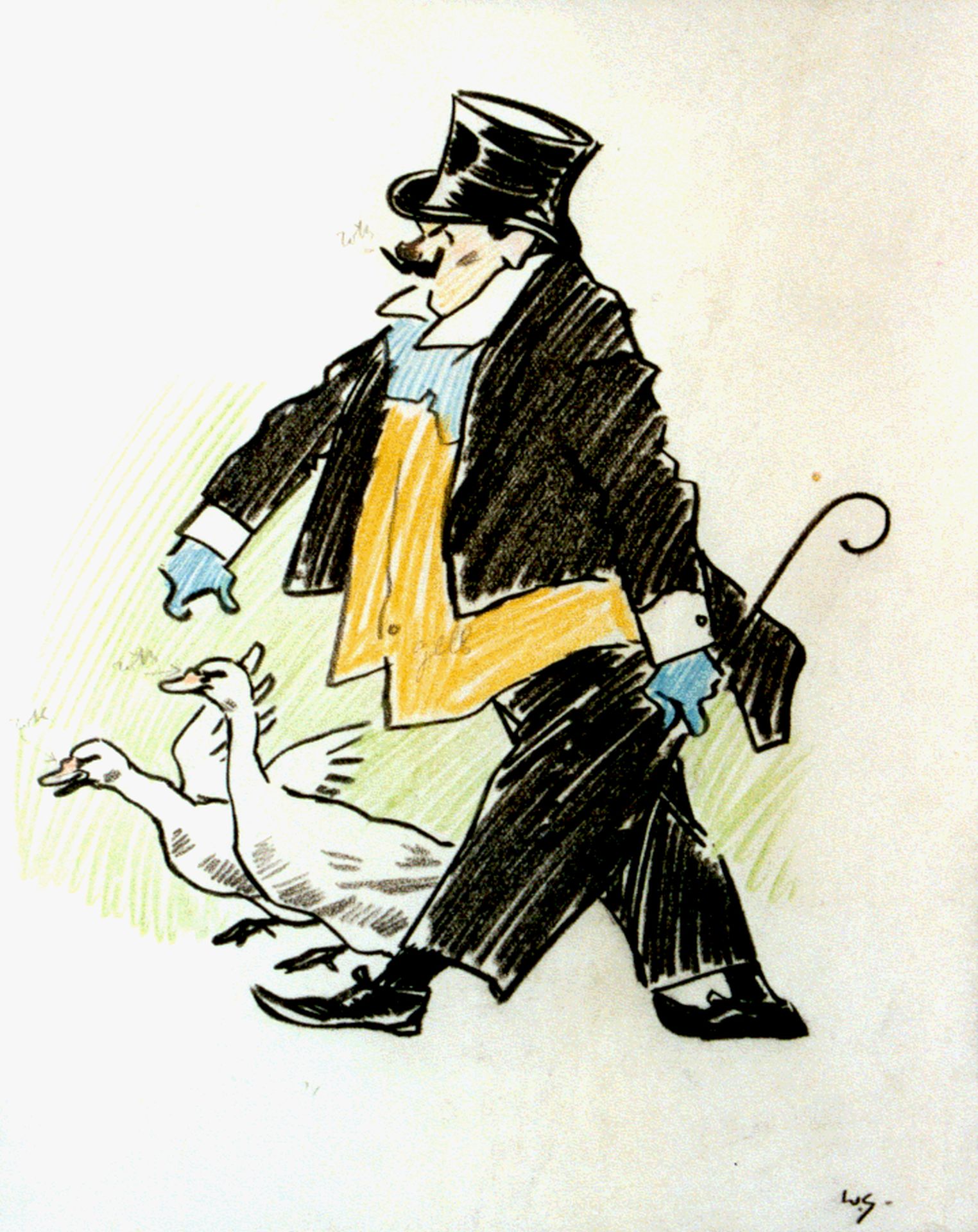 Willy Sluiter kunstwerk • aquarel • tekening • voorheen te koop Circusfiguur met ganzen