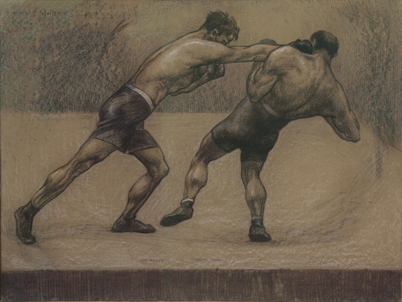 Sluiter J.W.  | Jan Willem 'Willy' Sluiter, De bokswedstrijd van Joe Beckett tegen Tommy Burns, Londen 1920, houtskool en pastel op papier op karton 74,3 x 99,0 cm, gesigneerd rechts van het midden en gedateerd 'London 1920'