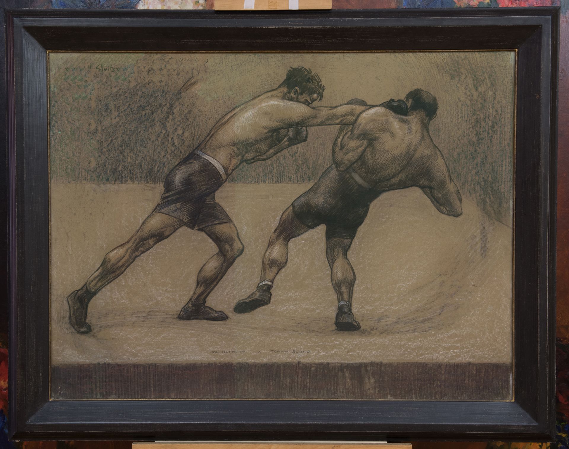 Willy Sluiter kunstwerk • aquarel • tekening • voorheen te koop De bokswedstrijd van Joe Beckett tegen Tommy Burns, Londen 1920