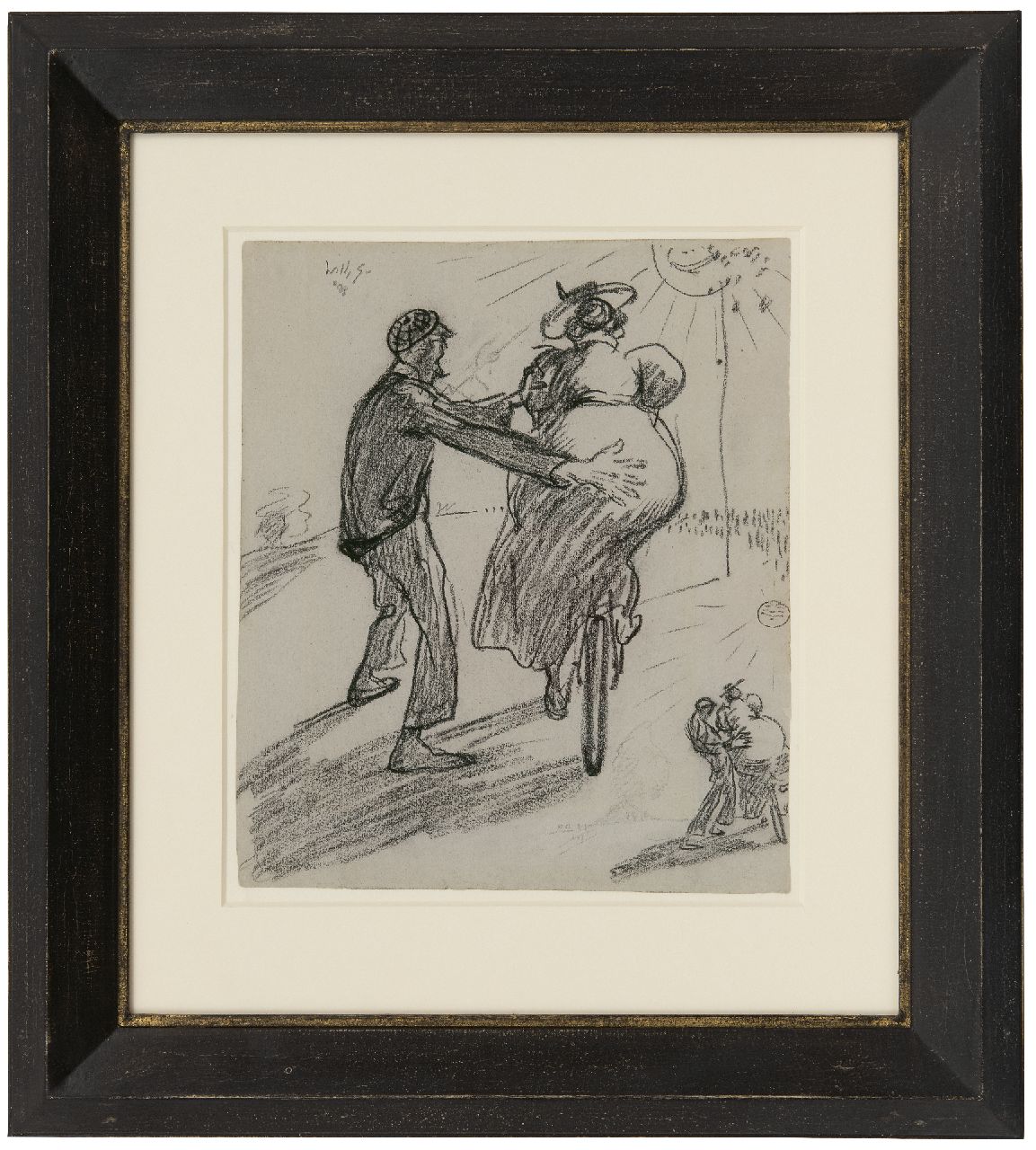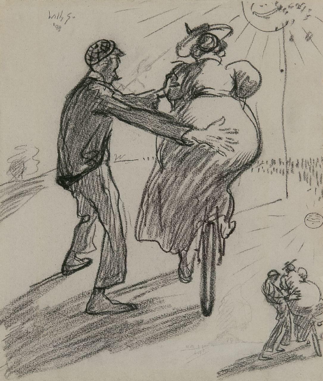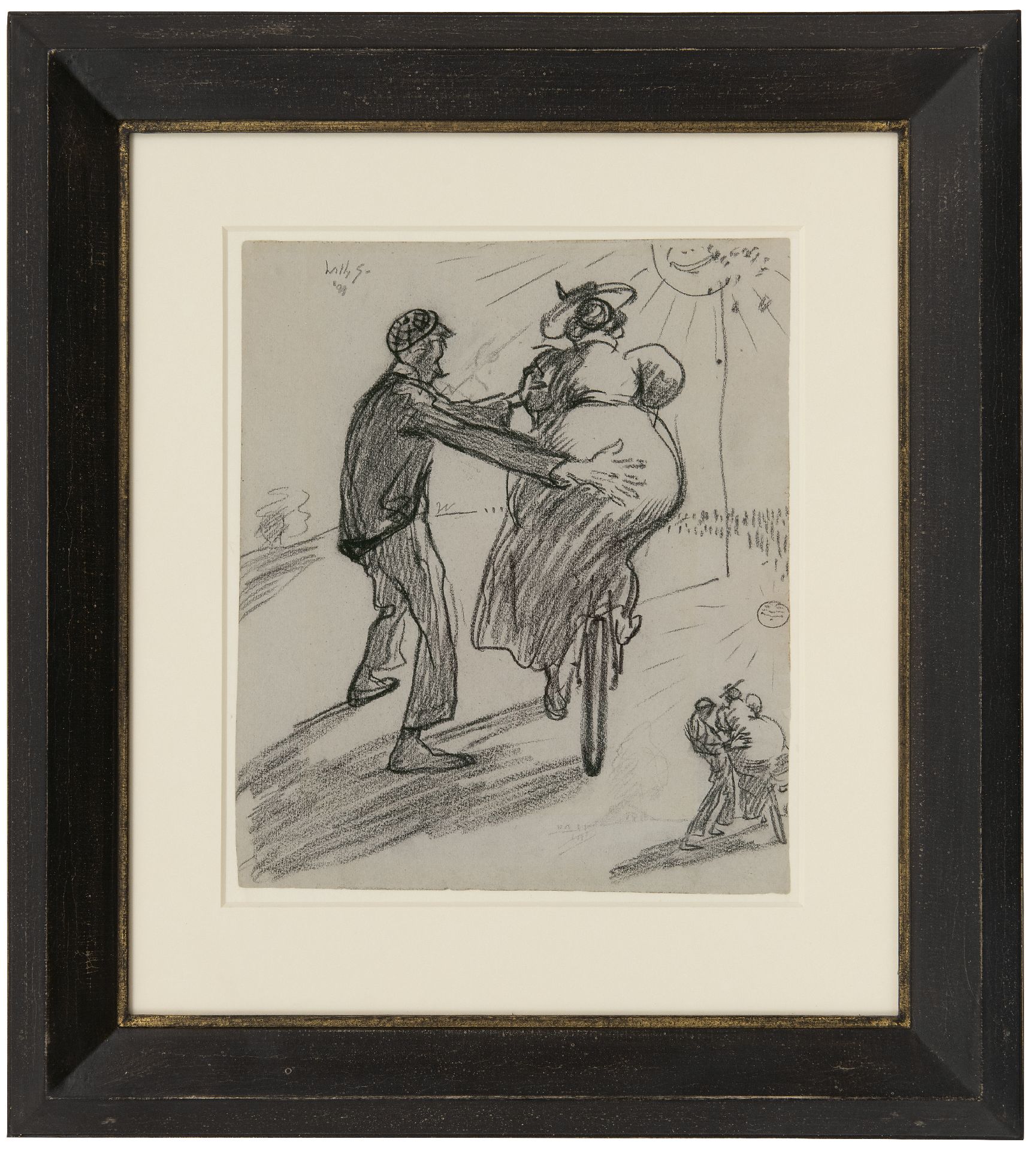 Willy Sluiter had twee uitgesproken talenten. Hij schilderde prachtige, impressionistische landschappen en haven- en strandgezichten. Daarnaast was hij een ras tekenaar die in staat was om in vlotte, vaak humorvolle schetsen en aquarellen het leven om zich heen vast te leggen. In zijn tekeningen van vrienden en familie, van het mondaine strand- en uitgaansleven in Scheveningen, van reizen en van de welgestelde sneeuwtoeristen in Davos en St. Moritz toont hij zich een chroniqueur va zijn tijd. Vanaf de jaren twintig was hij een bekend en zeer succesvol kunstenaar. Sluiters' tekentalent leidde ook tot vele opdrachten voor boekomslagen, illustraties en ander reclamewerk waarbij zijn affiches een speciale plaats innemen. Vanaf 1895 ontwierp hij zijn eerste ‘reclamebiljet’ maar vanaf 1908 wordt hij er bekend mee. Het kunstenaarsaffiche was ontstaan aan het eind van de 19e eeuw in Frankrijk, waar deze grafiek al meteen een verzamelobject werd, zoals later ook in ons land. Kenmerkend voor de affiches van Sluiter is vooral de humor. In 1908 ontwierp hij een affiche voor de firma Bakker Banden uit het bij Dordrecht gelegen Ridderkerk (zie: Moniek Peters en Peter Marijnissen, 'Willy Sluiter 1873-1949. Gentleman-kunstenaar', Gent 1999, pag. 106). De hier afgebeelde tekening is hoogstwaarschijnlijk een voorstudie voor dit affiche. Het werk toont een dikke dame die wankelend probeert op een fiets te stappen terwijl een man die haar in evenwicht houdt, tegen haar volle achterwerk duwt. In het uiteindelijke affiche is de man vervangen door een ondeugend kijkende jongen. Het beeld moet in die tijd flink de aandacht getrokken hebben . Wat, hoe je het ook wendt of keert, de bedoeling was en is van reclame.