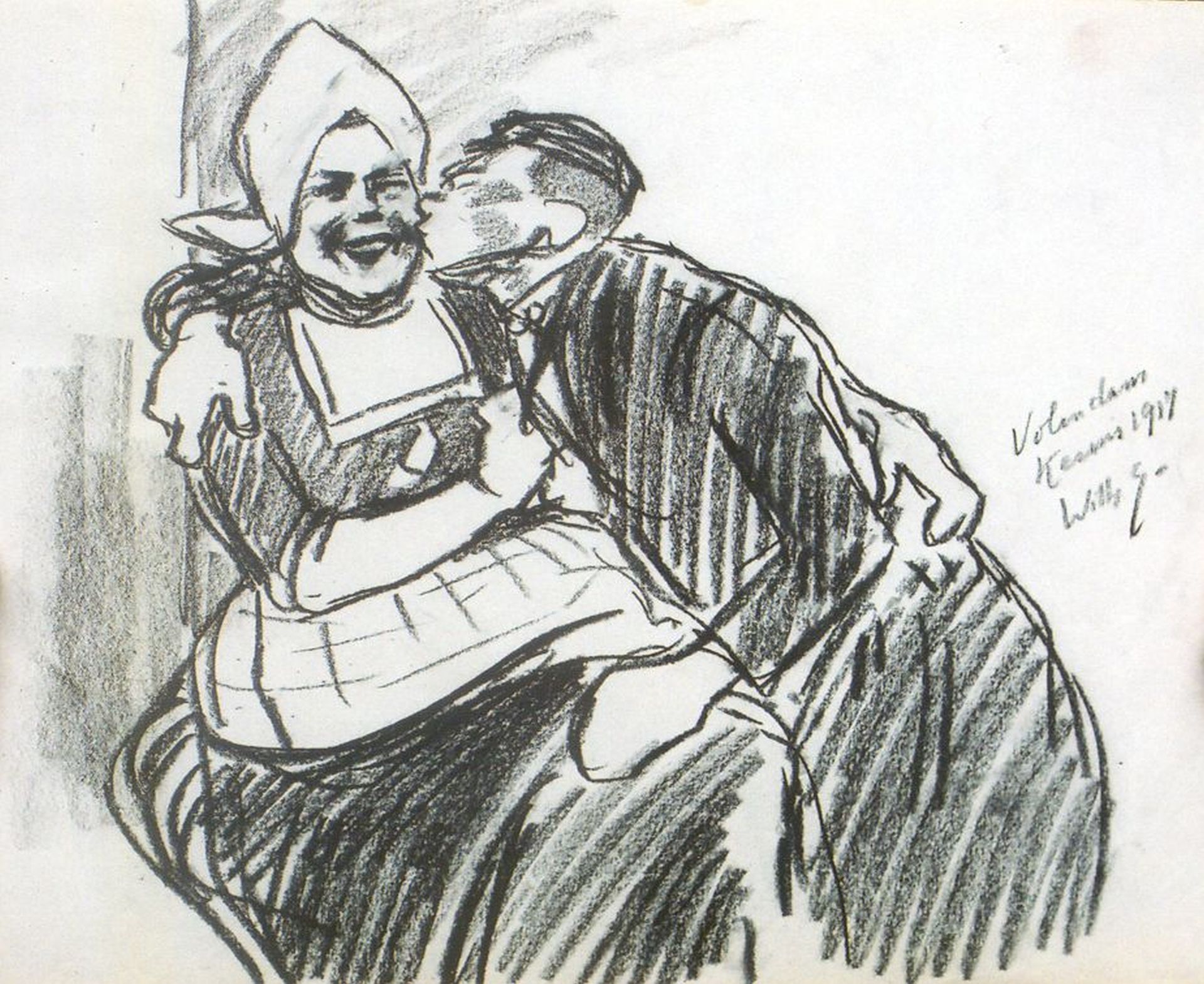 Willy Sluiter kunstwerk • aquarel • tekening • voorheen te koop Een kus op de kermis, Volendam