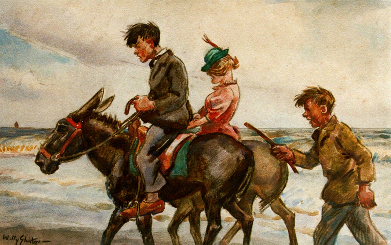 Willy Sluiter kunstwerk • aquarel • tekening • voorheen te koop Ezeltje rijden op het strand
