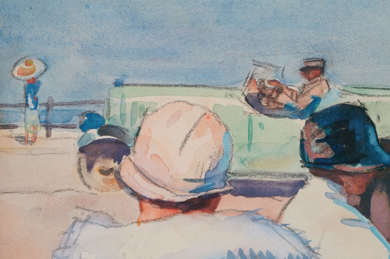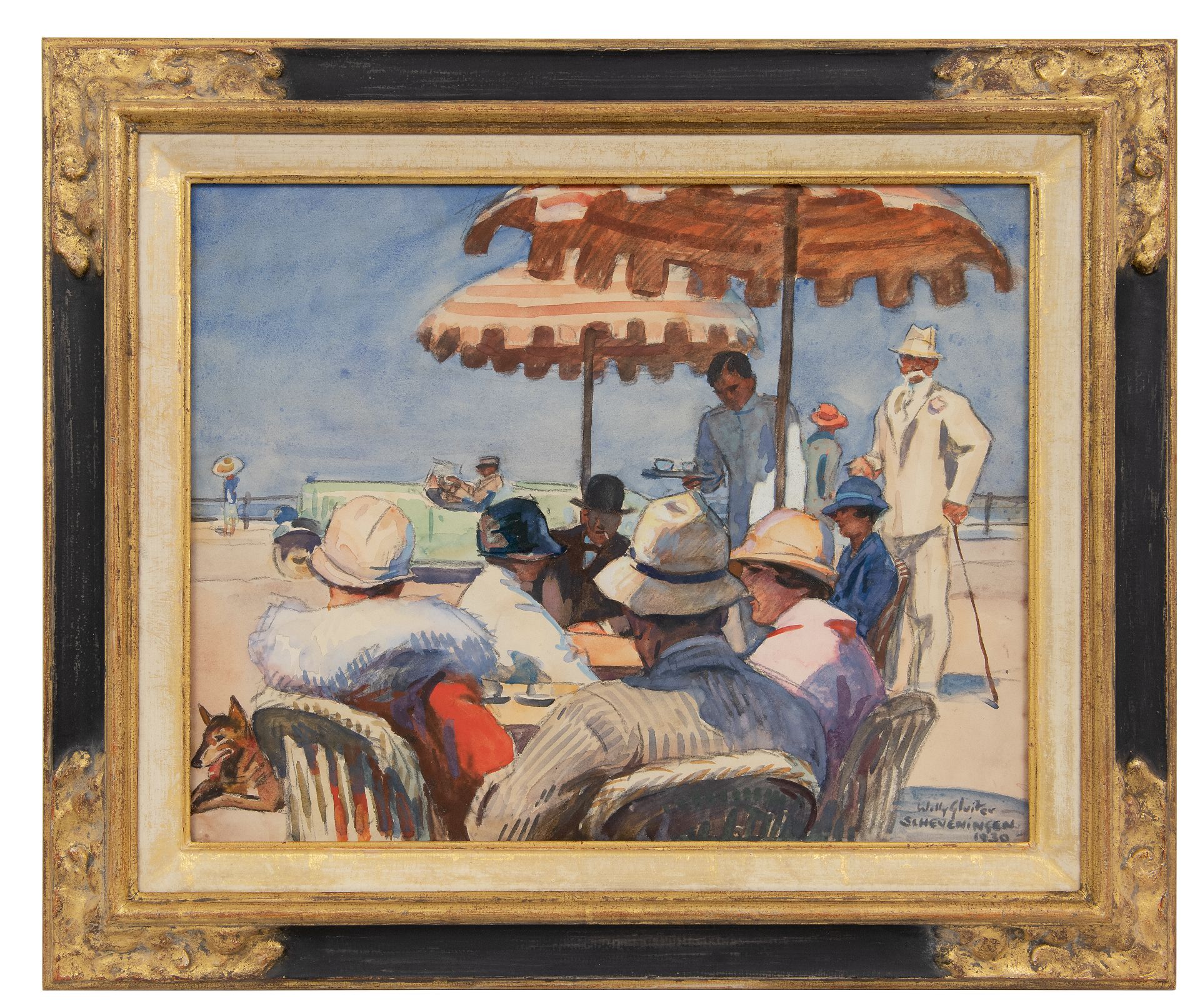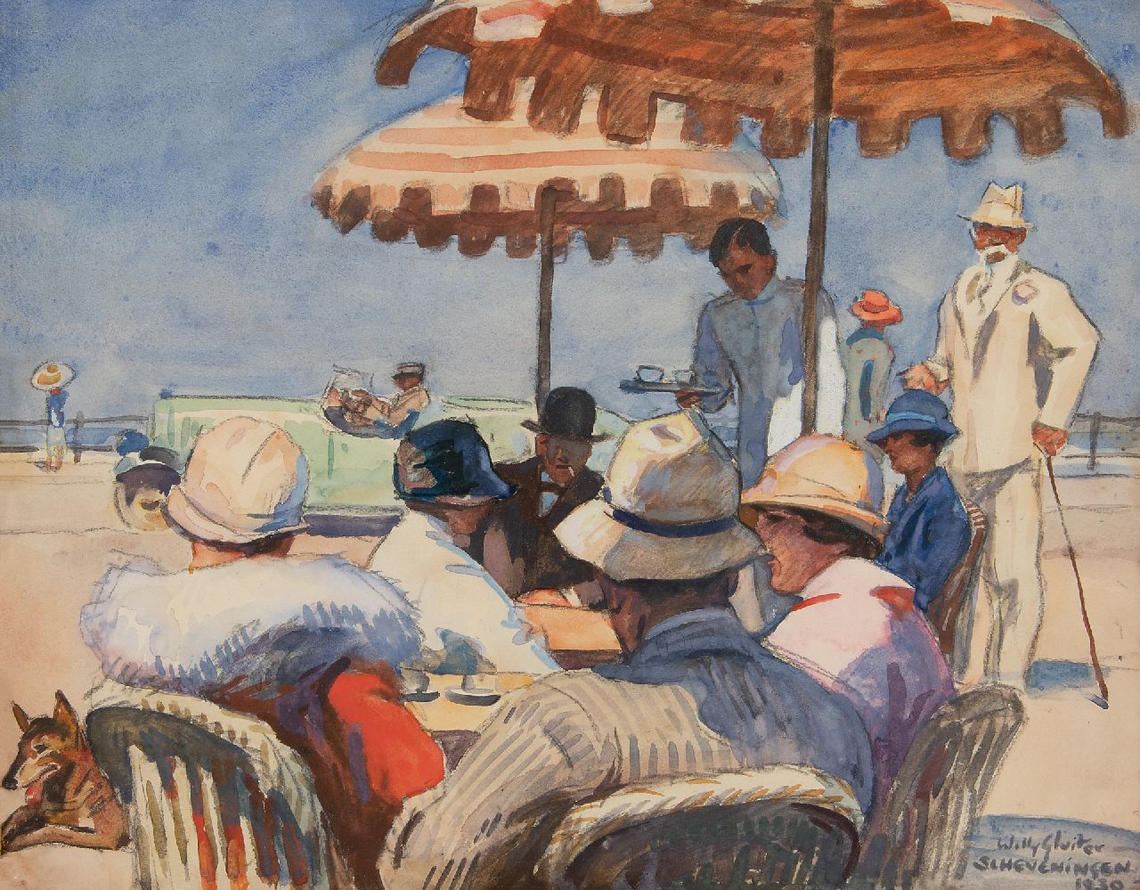 Willy Sluiter kunstwerk • aquarel • tekening • te koop Met de cabriolet over de Scheveningse boulevard