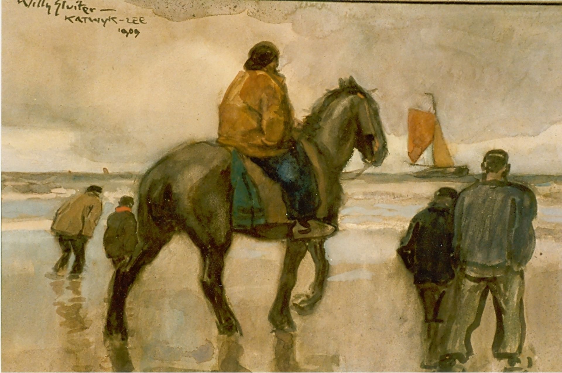 Willy Sluiter kunstwerk • aquarel • tekening • voorheen te koop Ruiter en wandelaars op het strand