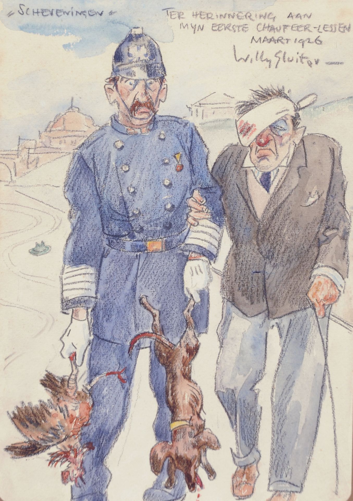 Willy Sluiter kunstwerk • aquarel • tekening • voorheen te koop 'Scheveningen - 'Ter herinnering aan mijn eerste chauffeer-lessen'