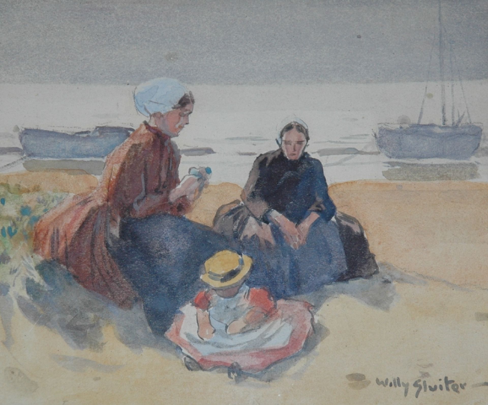 Willy Sluiter kunstwerk • aquarel • tekening • voorheen te koop Vissersvrouwen met kindje in de duinen