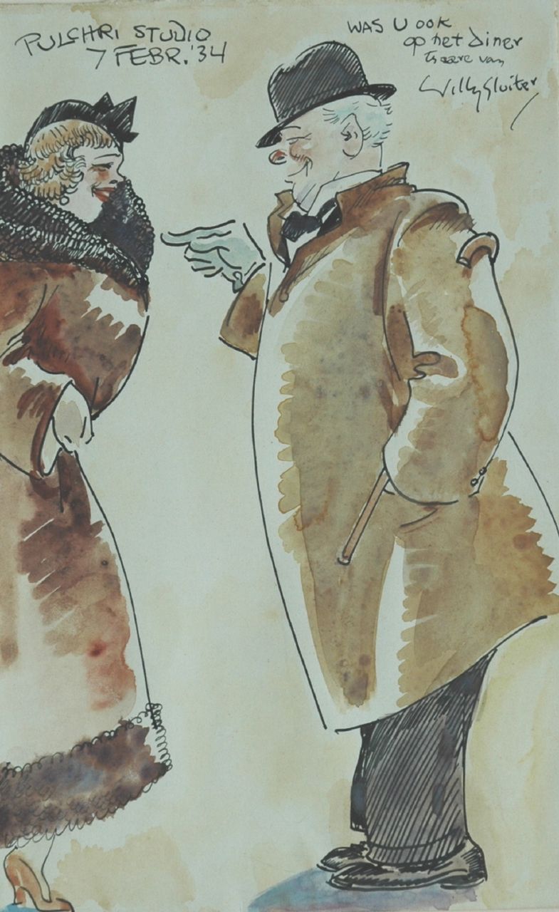 Willy Sluiter kunstwerk • aquarel • tekening • voorheen te koop 'Was U ook op het diner ter eere van Willy Sluiter': twee vrolijke dinergangers