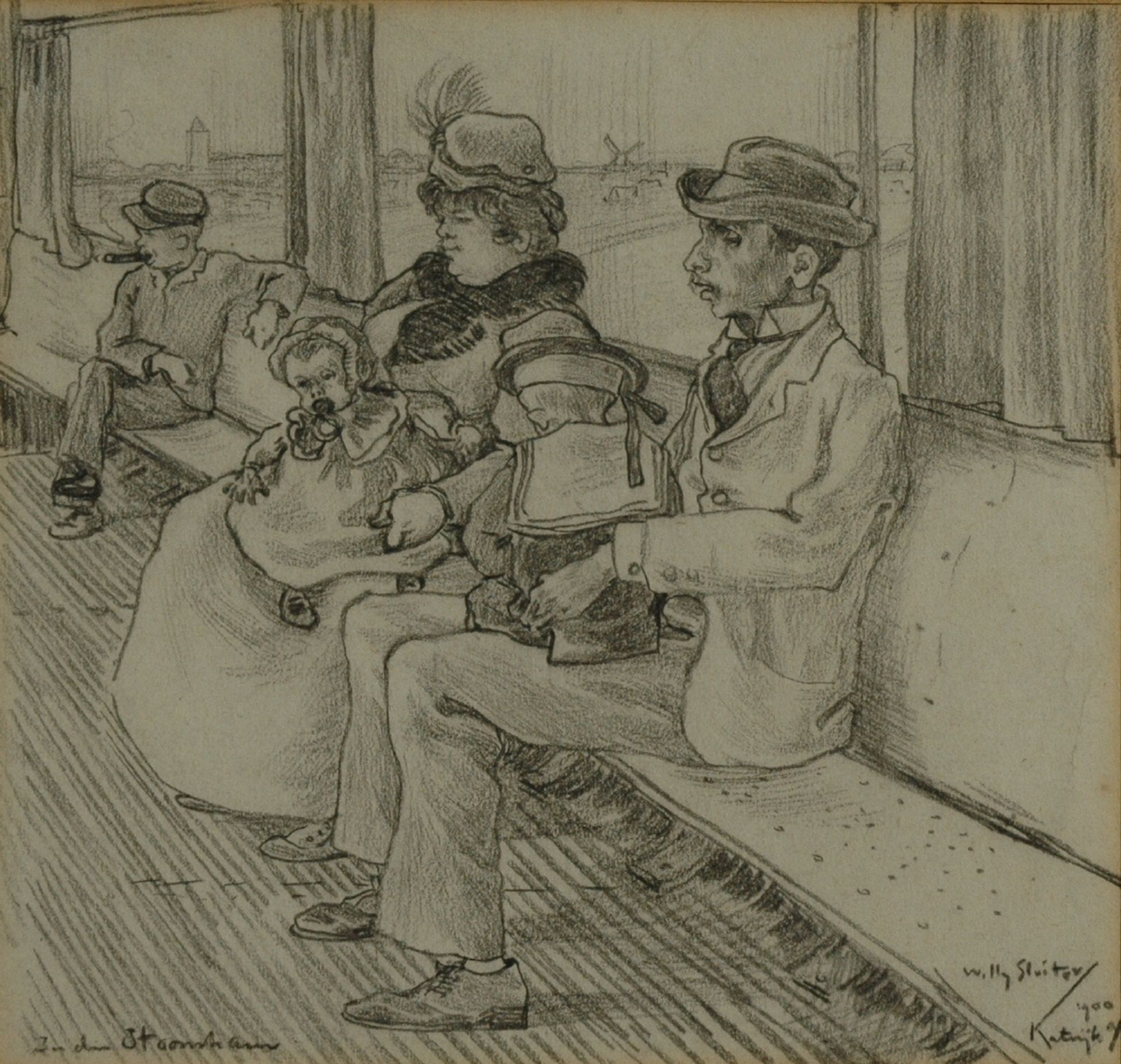 Willy Sluiter kunstwerk • aquarel • tekening • voorheen te koop Welgesteld Katwijks gezin in de stoomtram