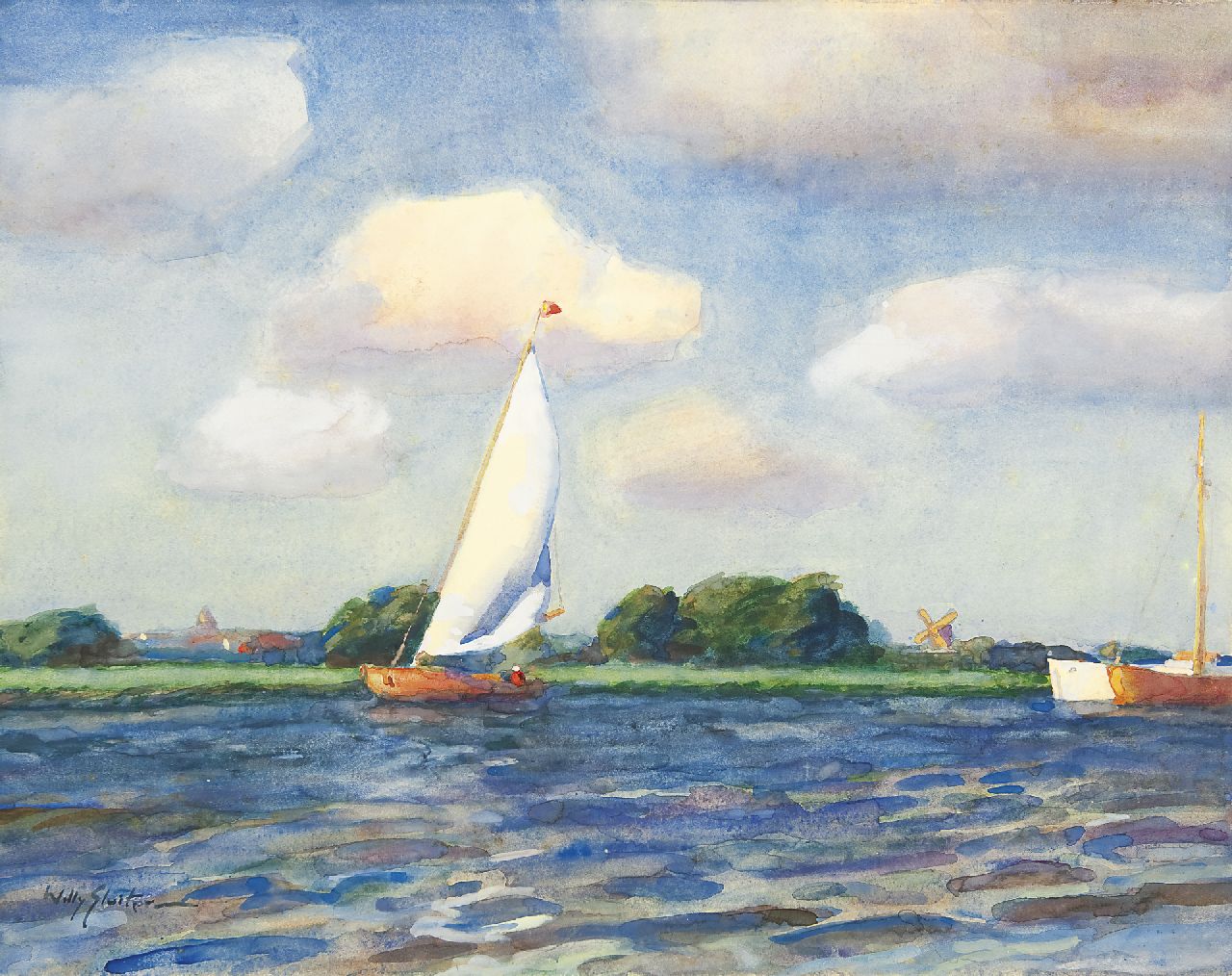 Willy Sluiter kunstwerk • aquarel • tekening • voorheen te koop Zeilboot op een plas