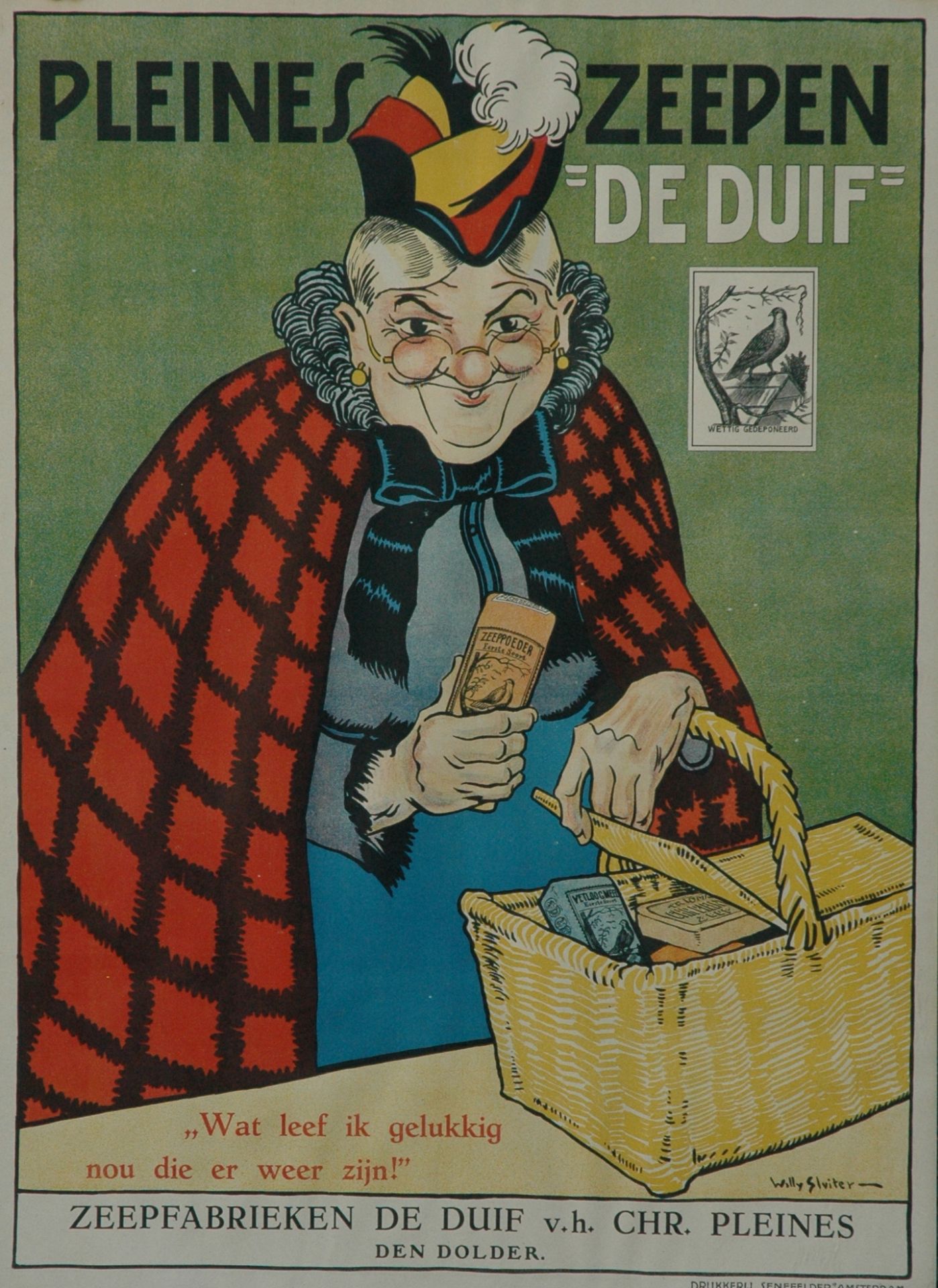 Willy Sluiter kunstwerk • grafiek • voorheen te koop Poster 'Pleines zeepen 'De Duif'. Wat leef ik gelukkig nou die er weer zijn!'