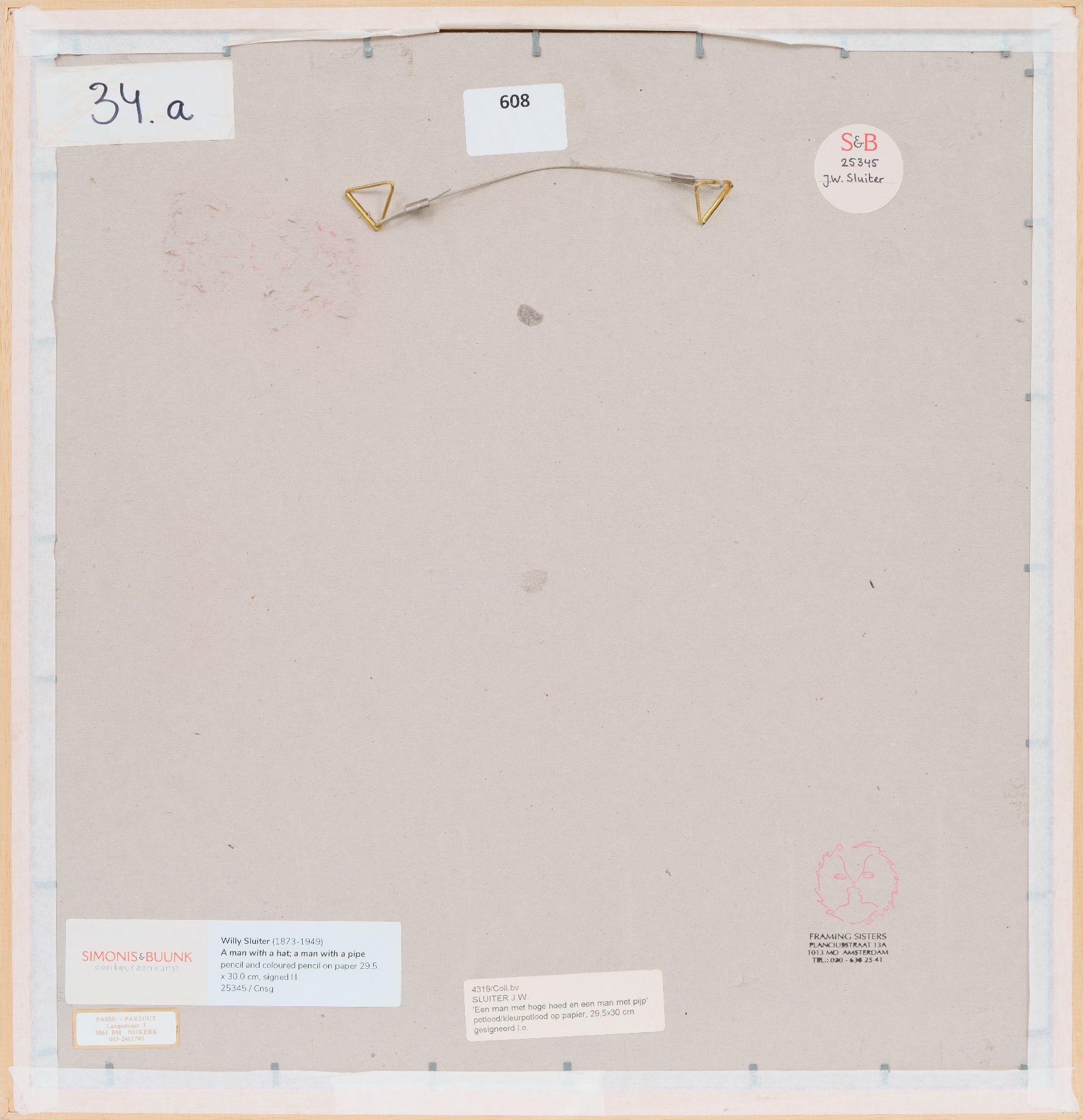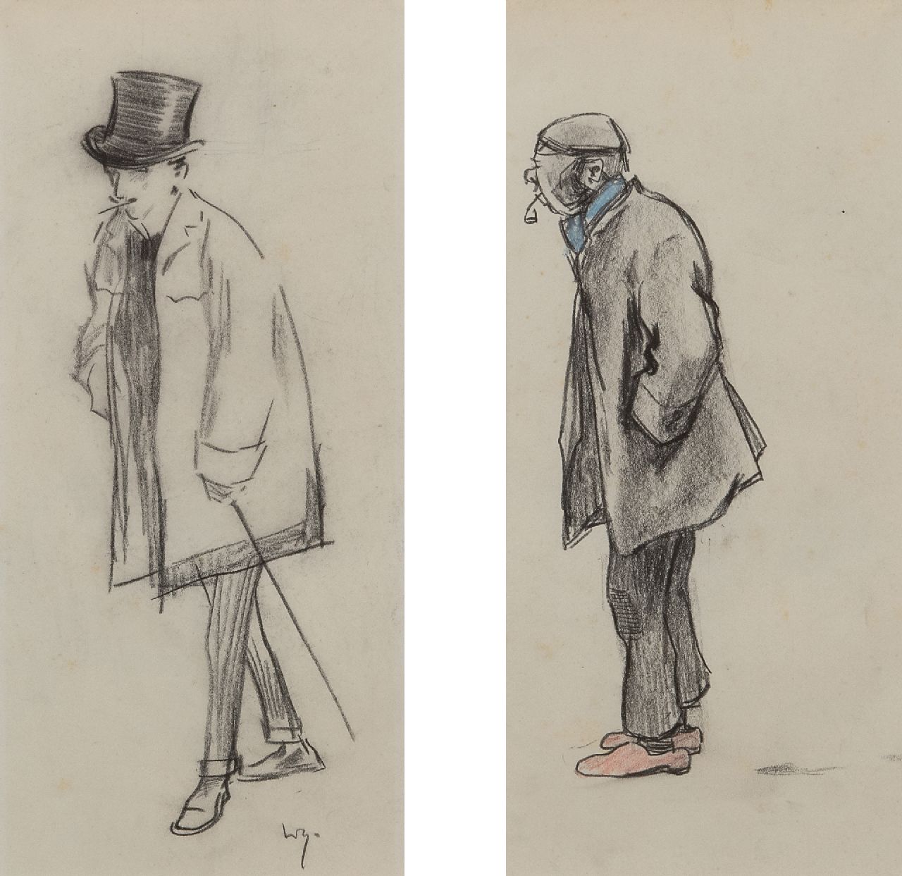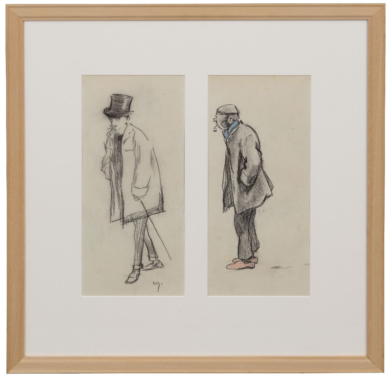 Willy Sluiter kunstwerk • aquarel • tekening • te koop Een heer met hoge hoed; een werkman met pijp