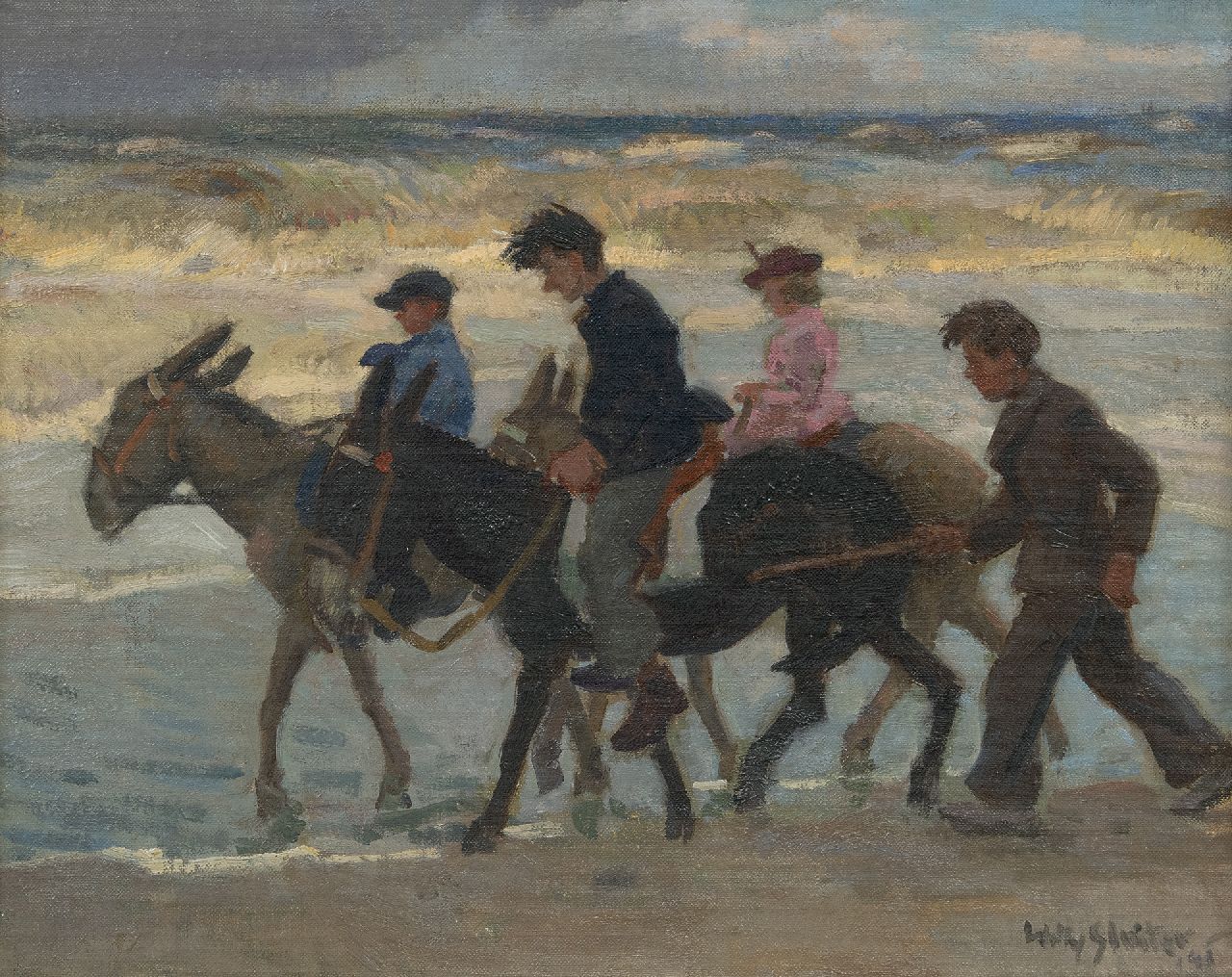 Lange tijd was het ezeltje rijden een populaire attractie voor kinderen op het Scheveningse en Zandvoortse strand. Ezeltjesbazen stonden daar klaar om voor een paar centen een ritje op de rug van een kleine ezel aan jonge strandbezoekers te verkopen. Sluiter schildert een dergelijk ritje in 1948, maar we weten dat aan het begin van de 20e eeuw deze attractie al in zwang was van het werk dat Isaac Israels rond 1900 ook al met dit onderwerp maakte. Ezeltje rijden was een van de vele attracties die zich ontwikkelden toen men erachter kwam dat frisse zeelucht heilzaam was voor de fysieke en geestelijke gezondheid van de mens en steeds meer mensen hun vertier langs de stranden van de Nederlandse kust zochten.