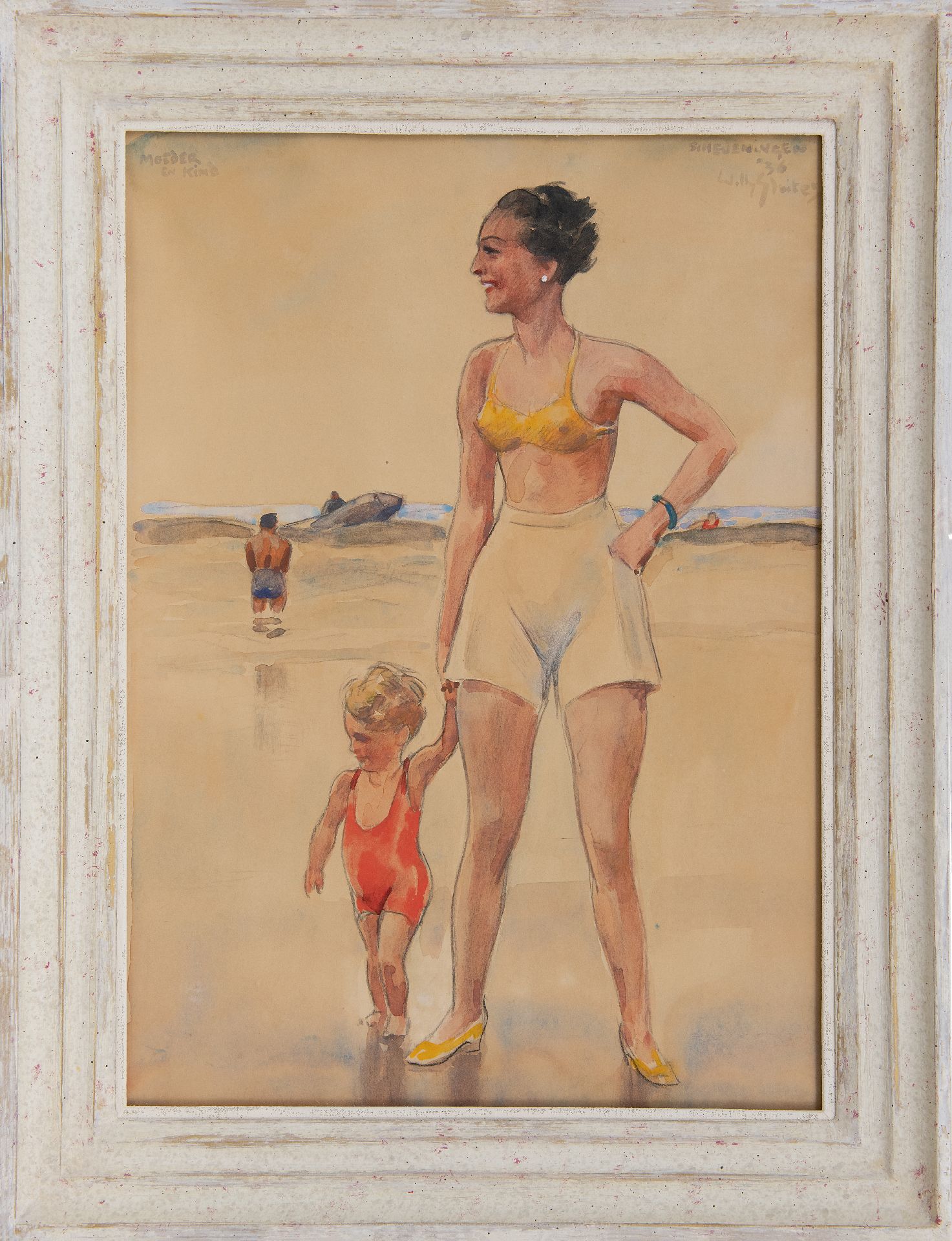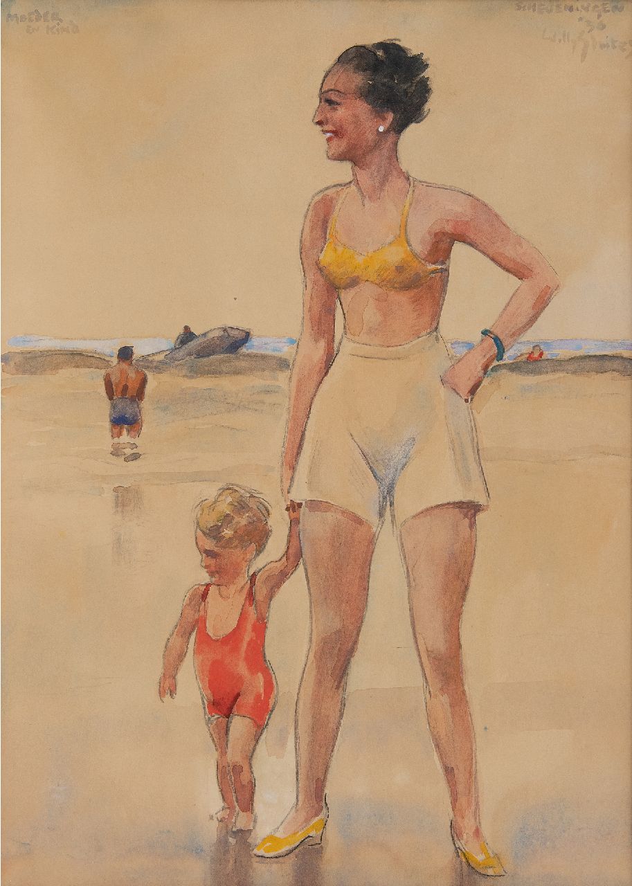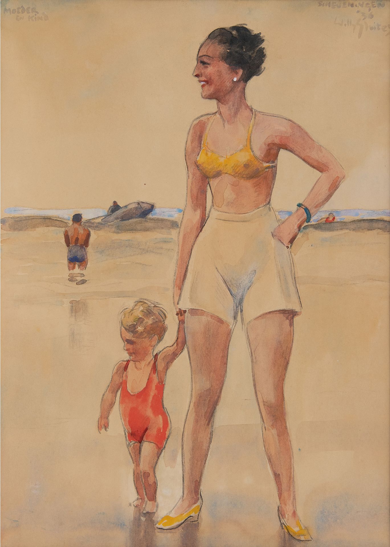 Willy Sluiter kunstwerk • aquarel • tekening • voorheen te koop Moeder en kind aan zee, Scheveningen