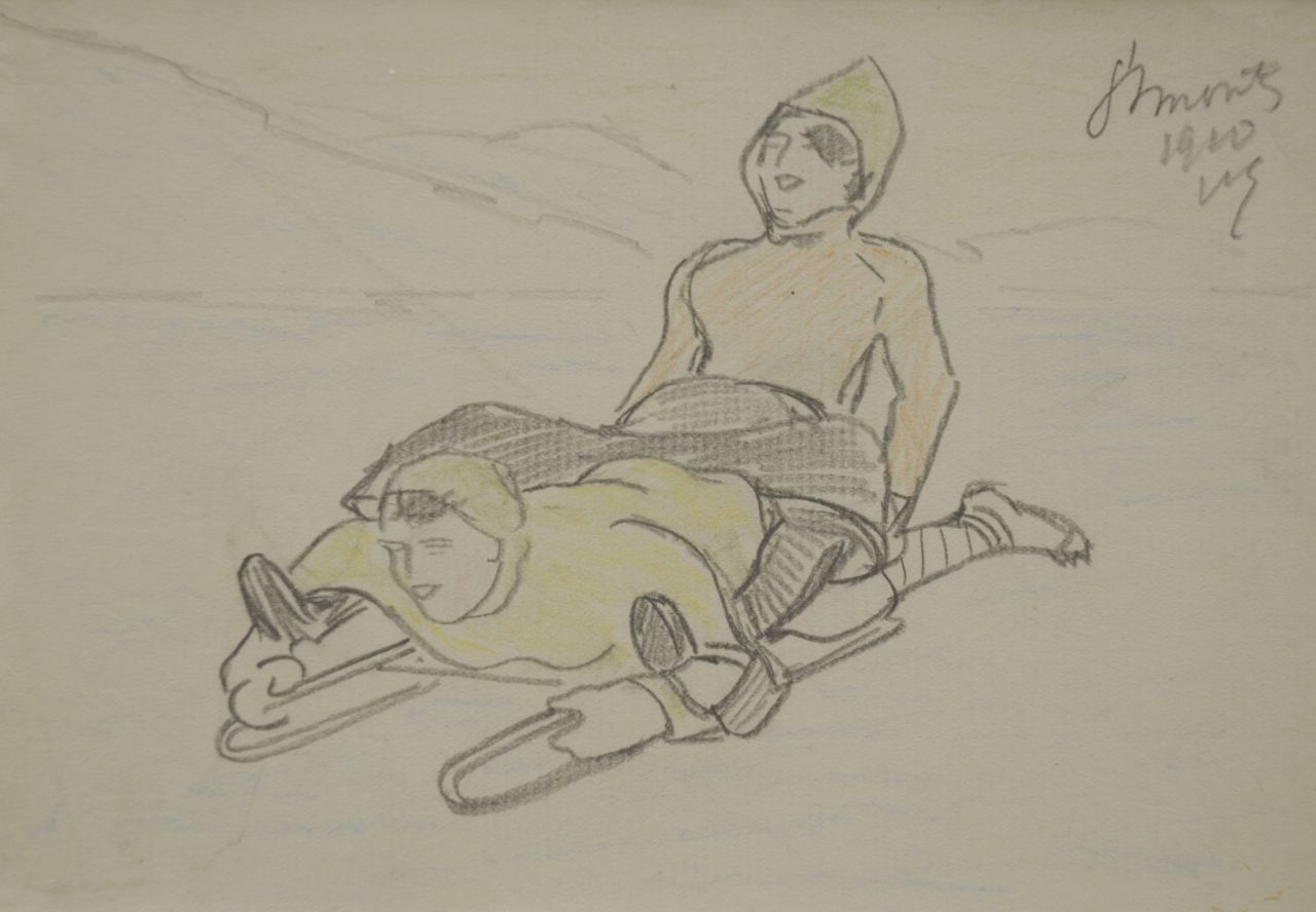 Willy Sluiter kunstwerk • aquarel • tekening • voorheen te koop Samen op de bobslee