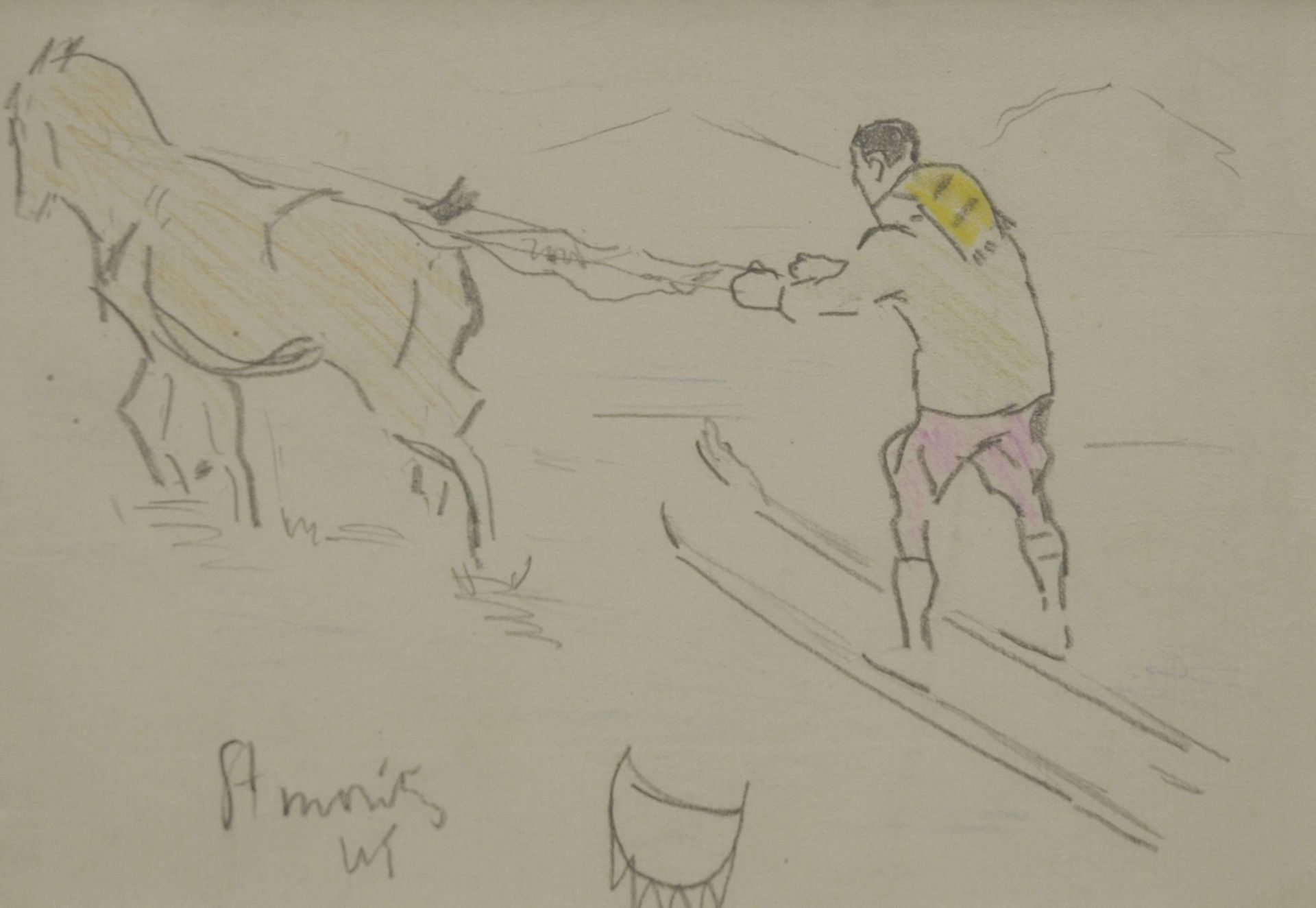 Willy Sluiter kunstwerk • aquarel • tekening • voorheen te koop Ski joering, St. Moritz 1910