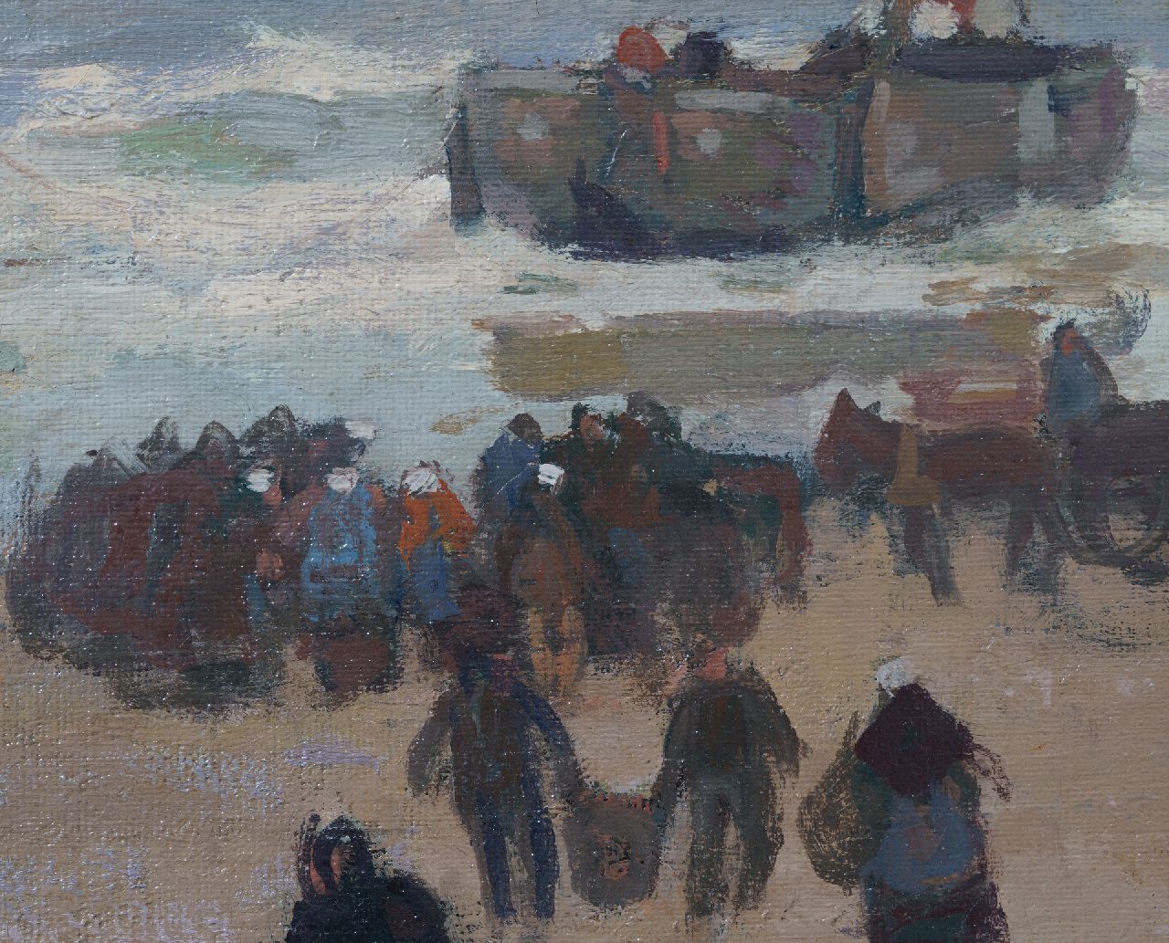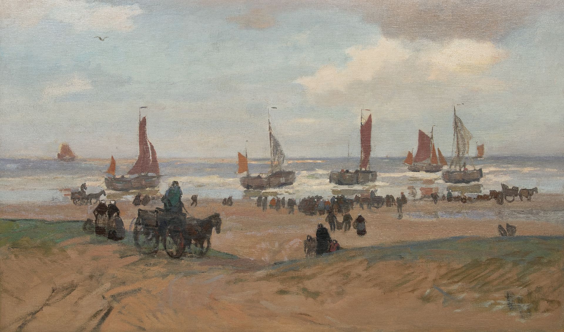 Willy Sluiter kunstwerk • schilderij • te koop Wachten op de vangst op het strand van Katwijk aan Zee